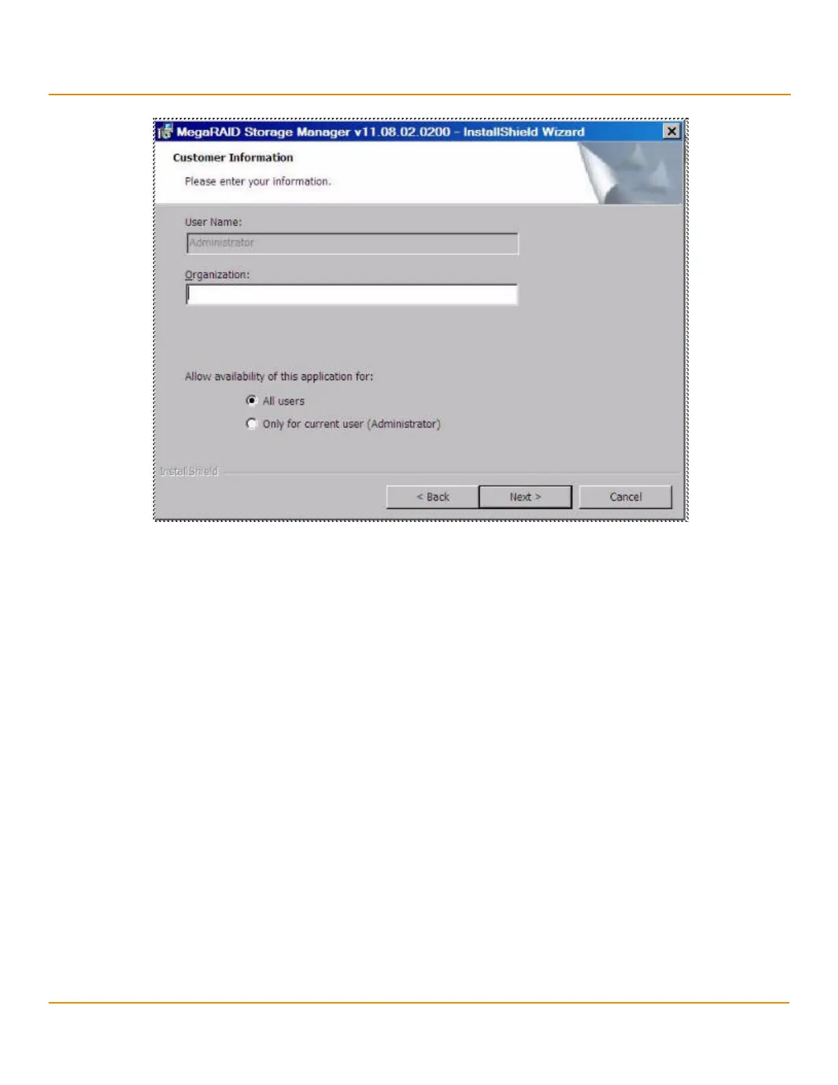 — If you select the Only for current user radio button, the MegaRAID Storage Manager software shortcuts and