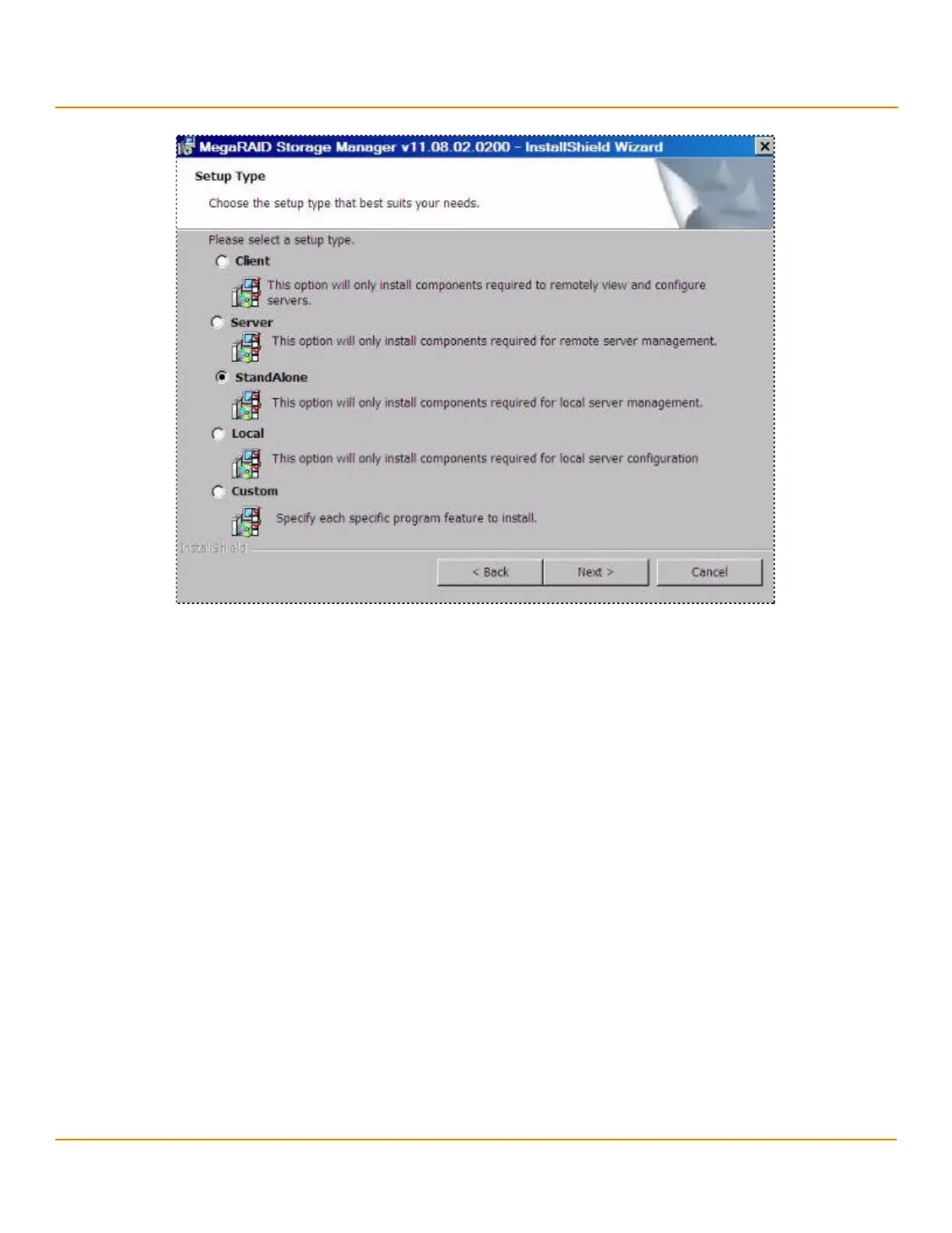 The MegaRAID Storage Manager software enables you to select from one of the following setup options when you