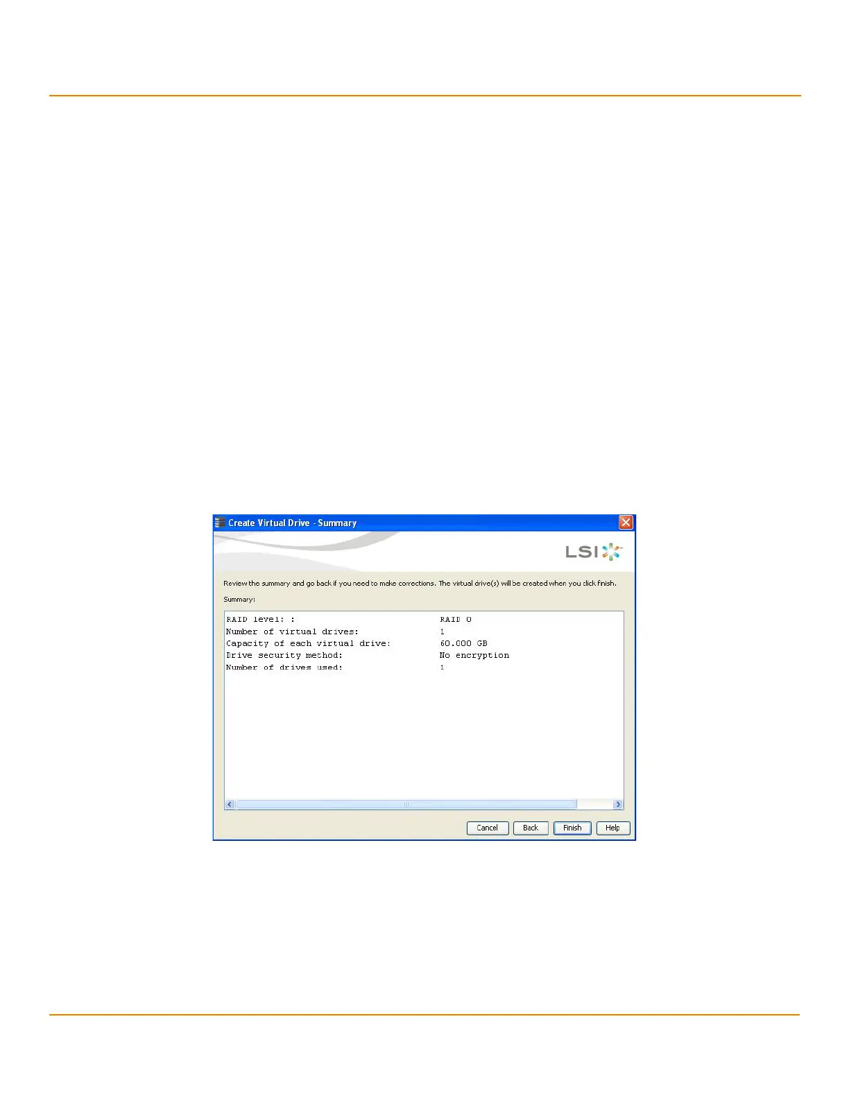 The Create Virtual Drive - Summary window appears, as shown in the following figure. This window shows the