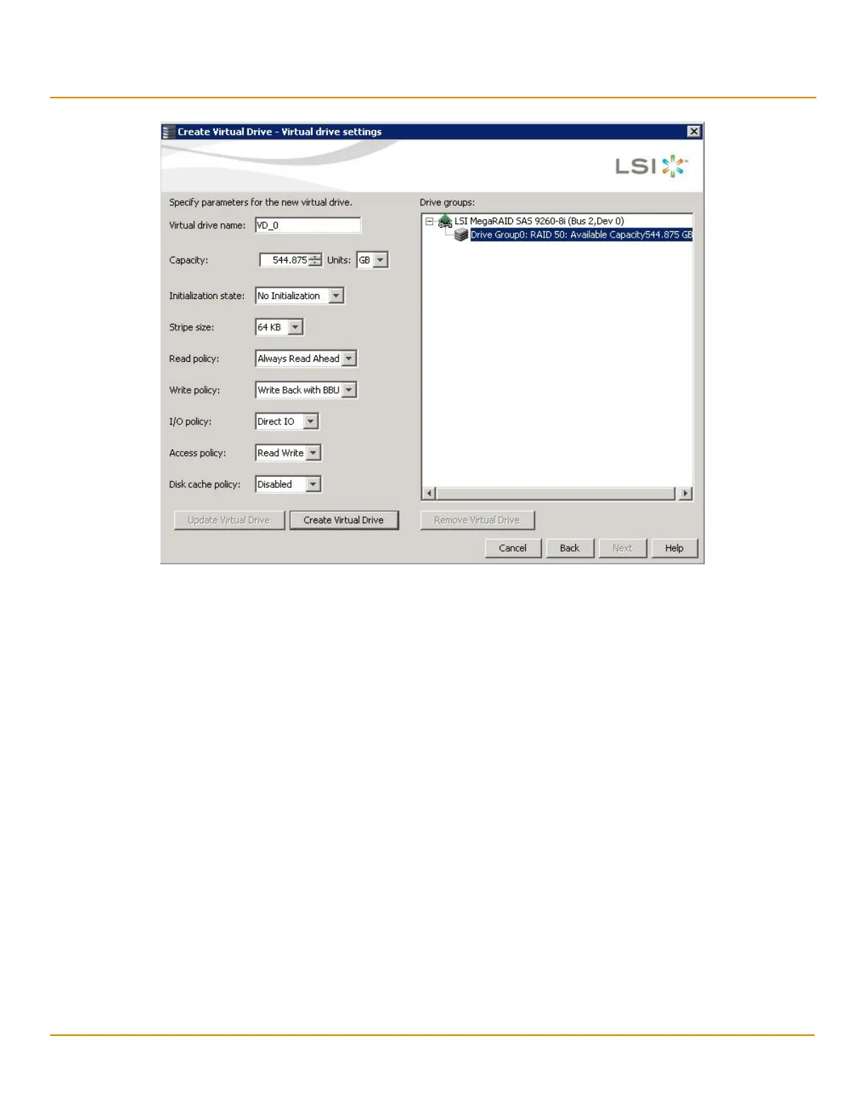 Figure 161 Create Virtual Drive - Virtual Drive Settings Window