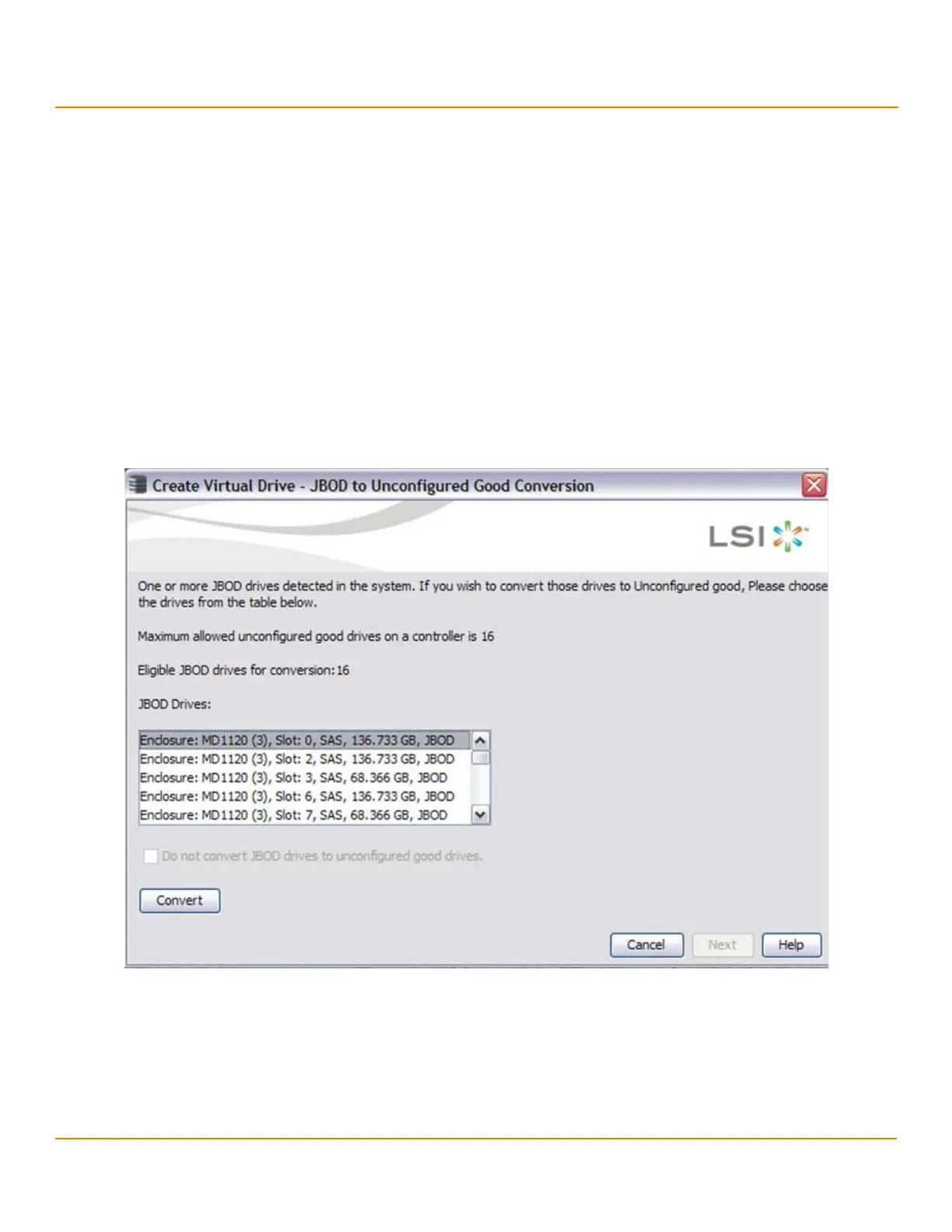 2. Select the drives which you want configured as Unconfigured Good and then click Convert. Clicking on Convert