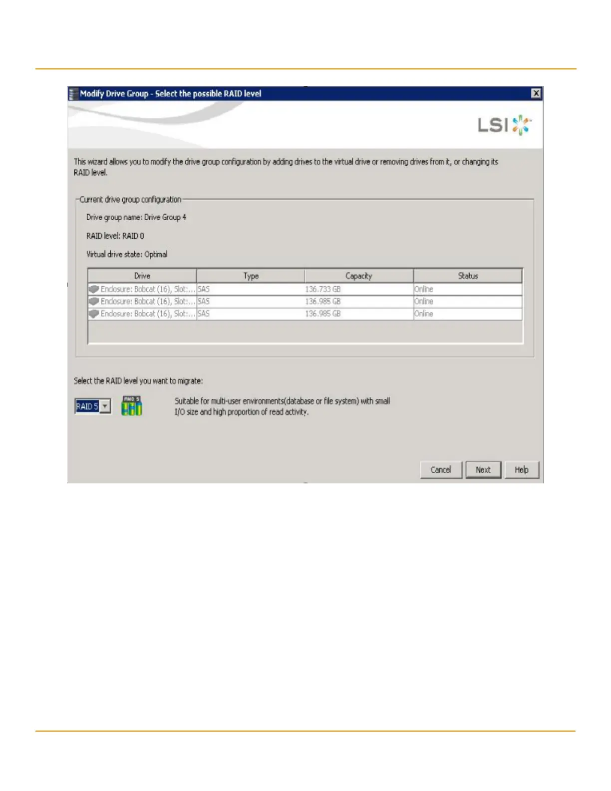 4. Select the RAID level to which you want to change ("migrate") the drive group, and click Next.