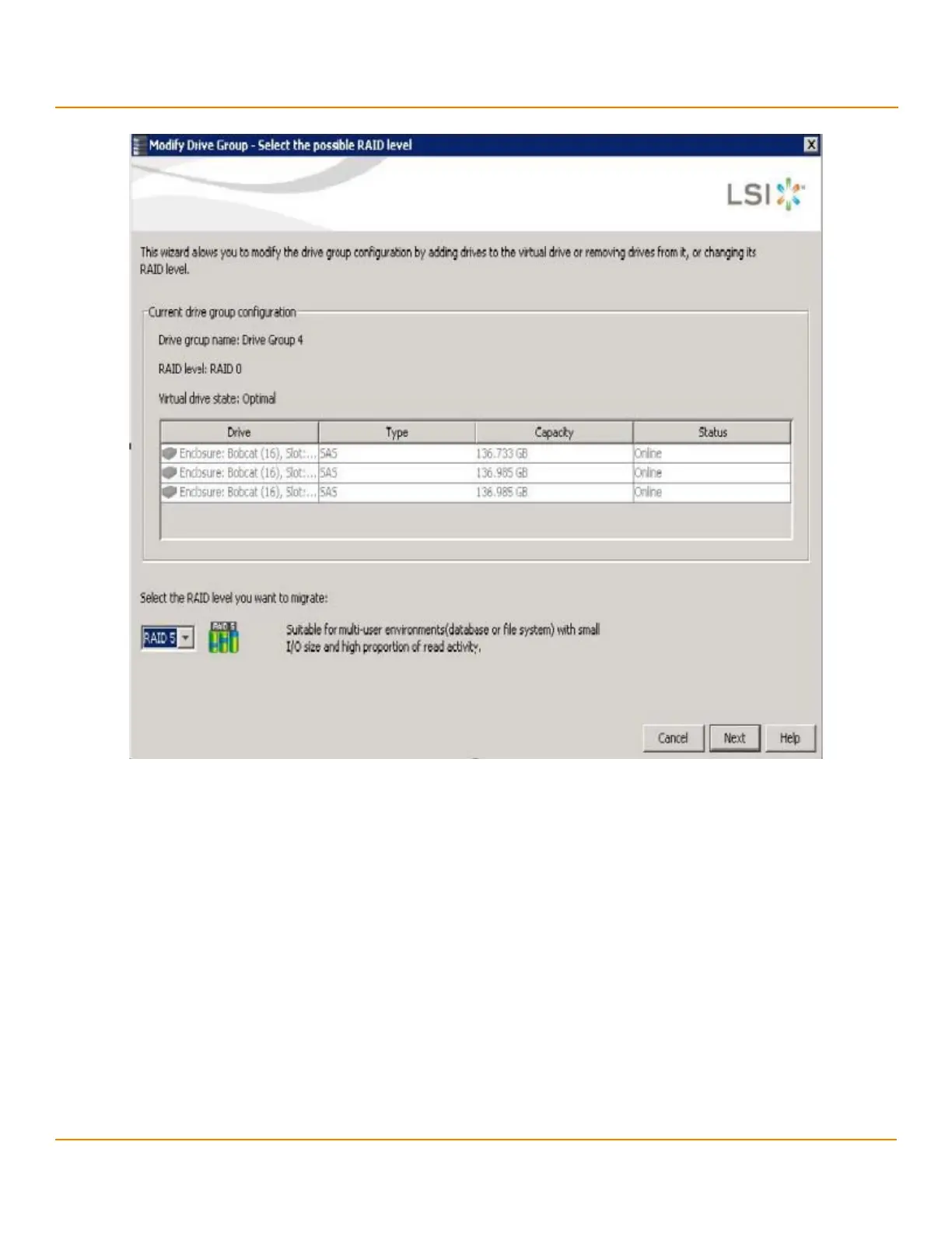 4. On the Modify Drive Group Wizard dialog, select the RAID level to which you want to change ("migrate") the