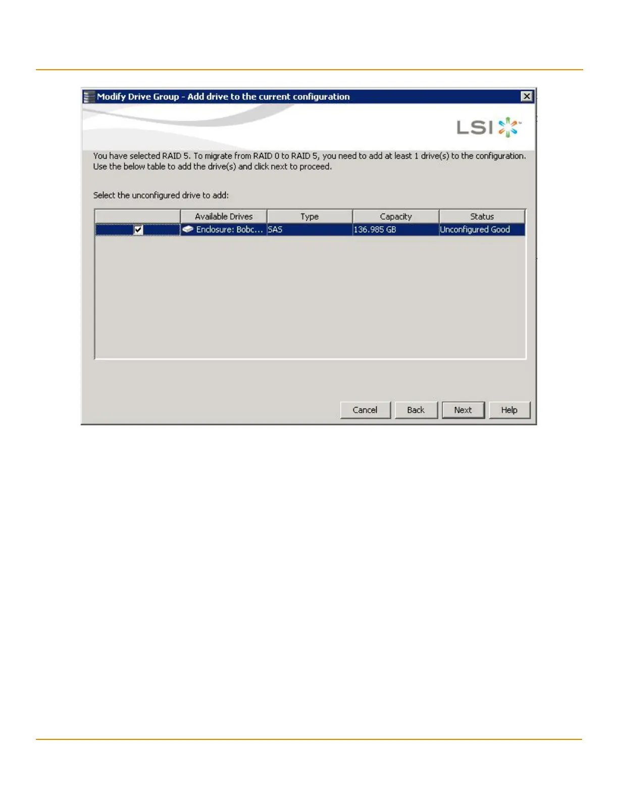 5. Select the unconfigured drive or drives to add, and click Next.