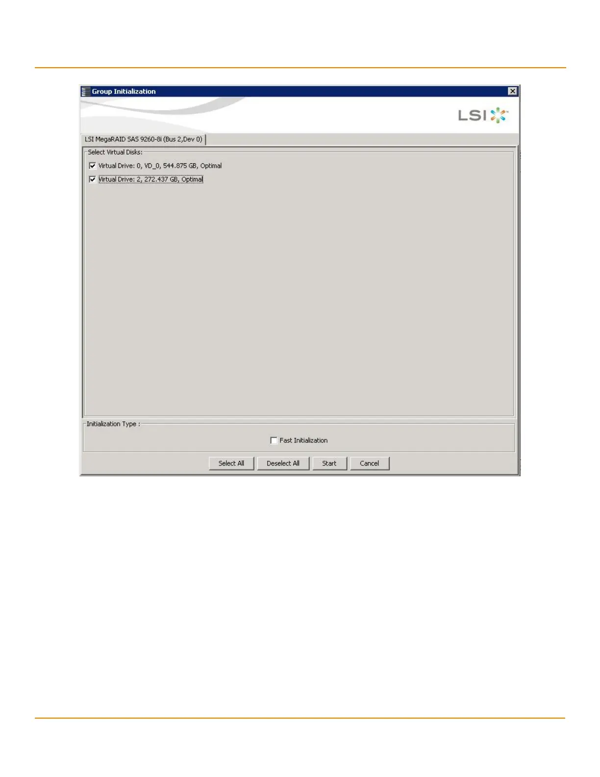 2. Either check the virtual drives on which to run the initialization, or click Select All to select all of the virtual drives.