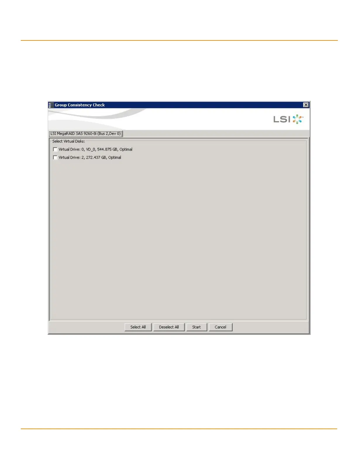 2. Either check the virtual drives on which to run the consistency check, or click Select All to select all of the virtual
