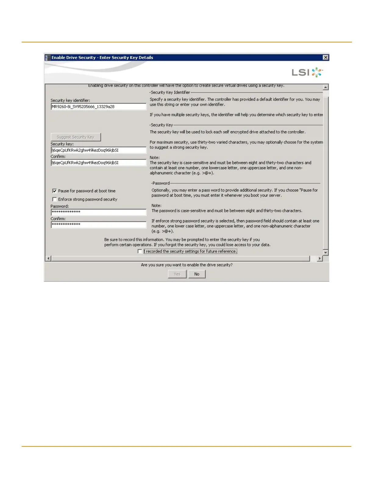 9. Select the I recorded the security settings for future reference check box, and click Ye s to confirm that you
