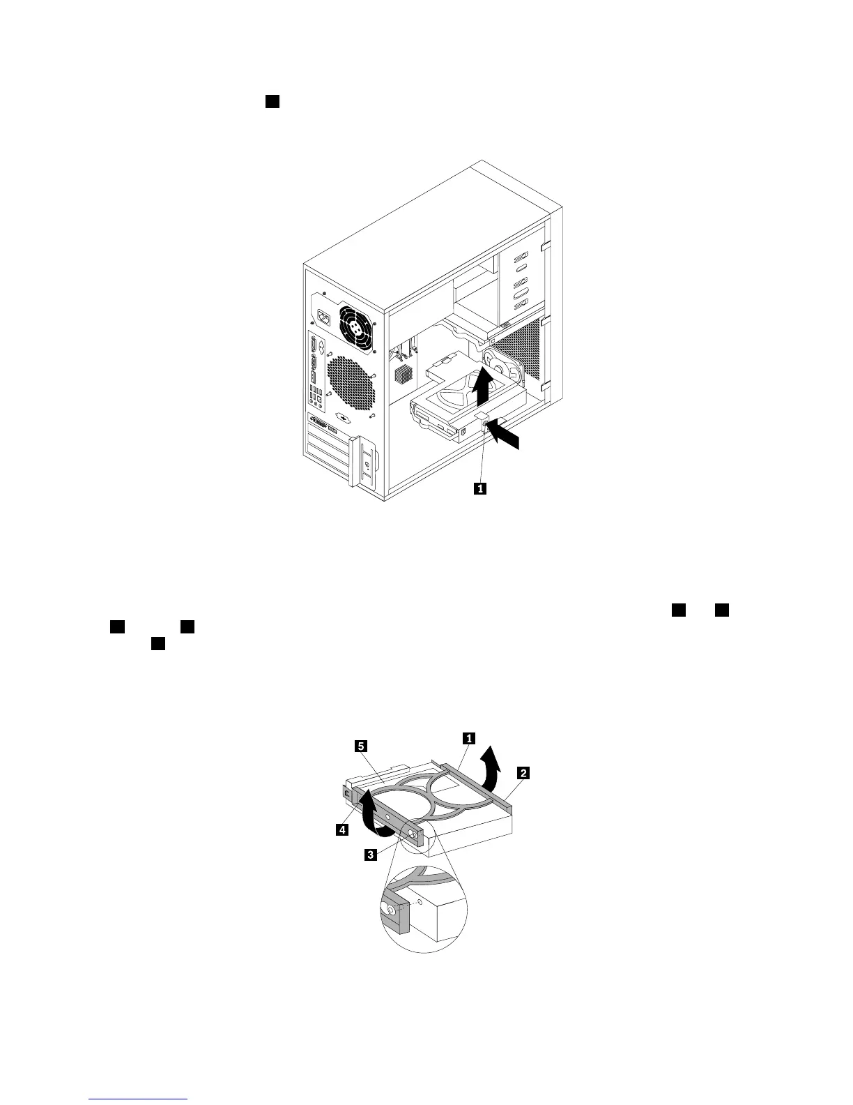 5.Pressthereleasebutton1toreleasetheharddiskdrivecageandthenlifttheharddiskdrivecage