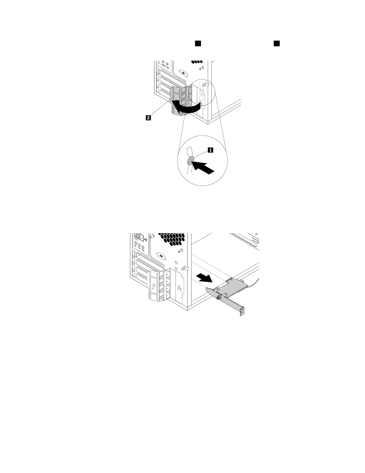 4.Attherearofthecomputer,pressthereleasebutton1toopenthePCIcardlatch2.