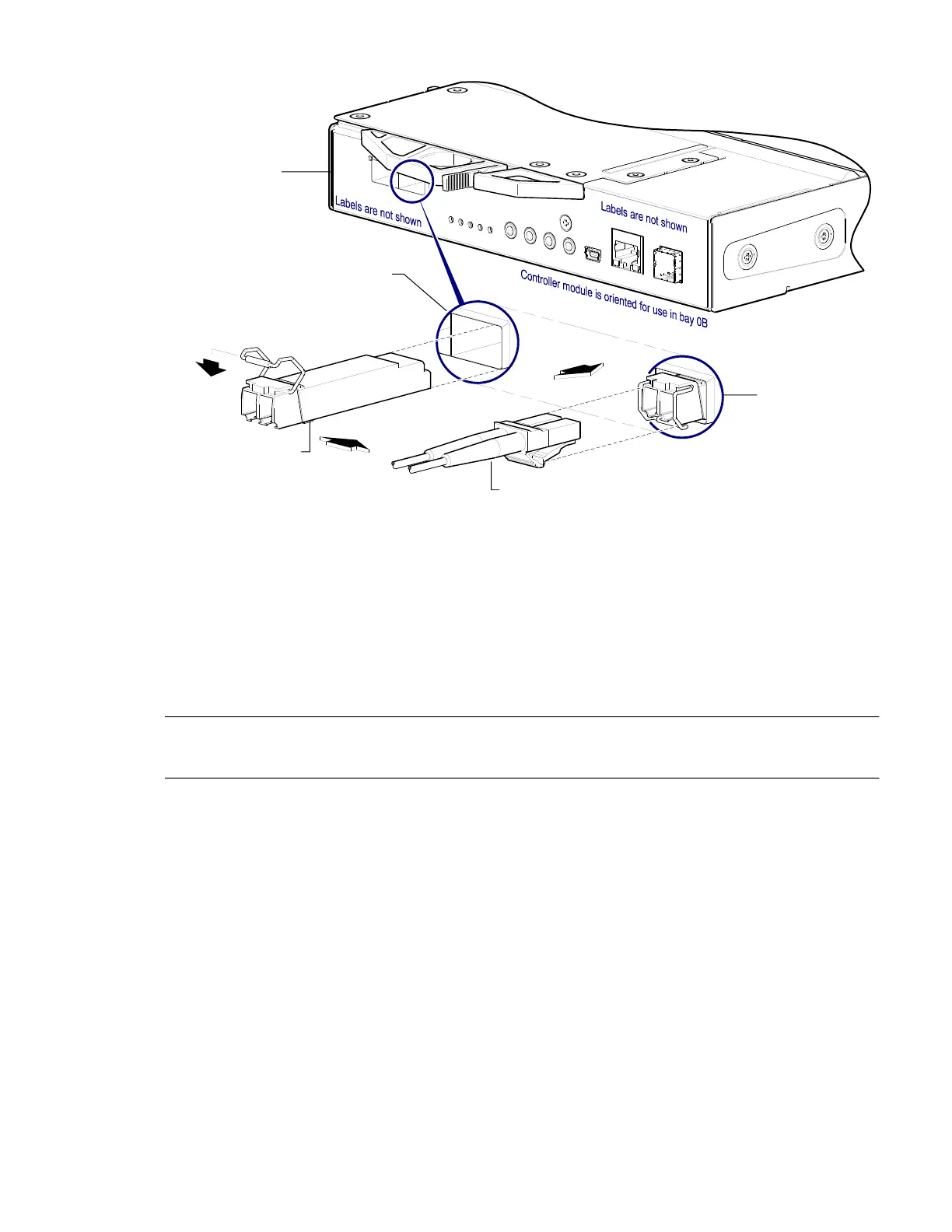 Figure 107 Install a qualified SFP option into an DS2200 FC/iSCSI controller module