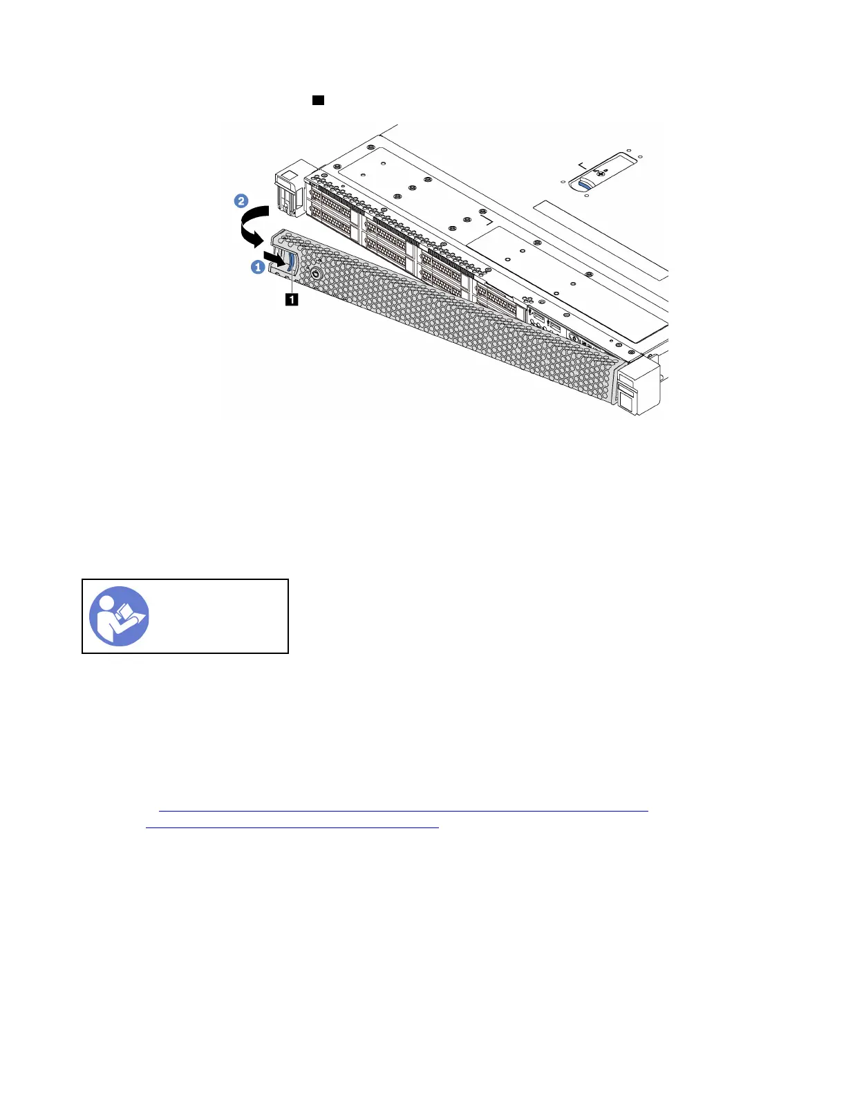 Step 2. Press the blue release latch 1 and pivot the security bezel outward to remove it from the chassis.