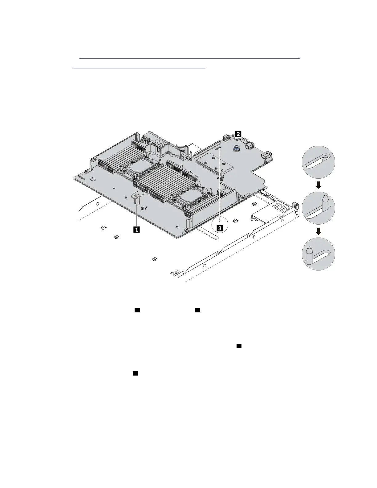 a. Hold the lift handle 1 and the release pin 2 at the same time to lower the system board into