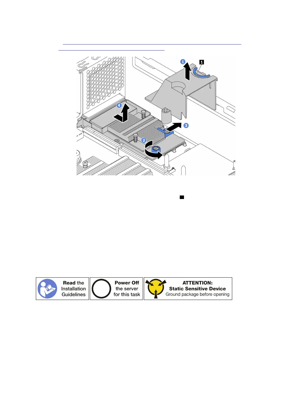 Step 1.  Remove the LOM-adapter air baffle by pinching the tab  1  and then lifting the air baffle out of the
