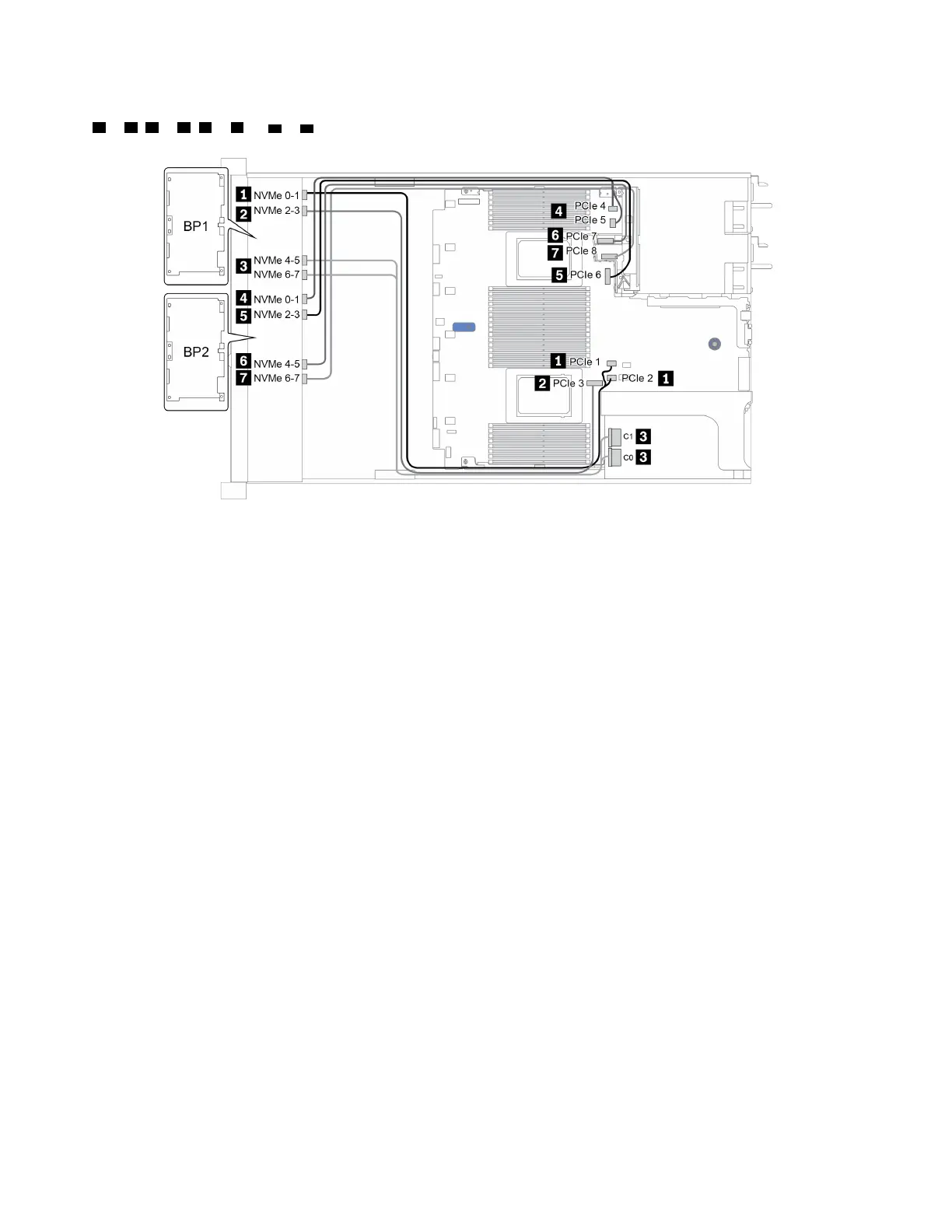 The following illustration shows the cable routing for the configuration 1. Connections between connectors: