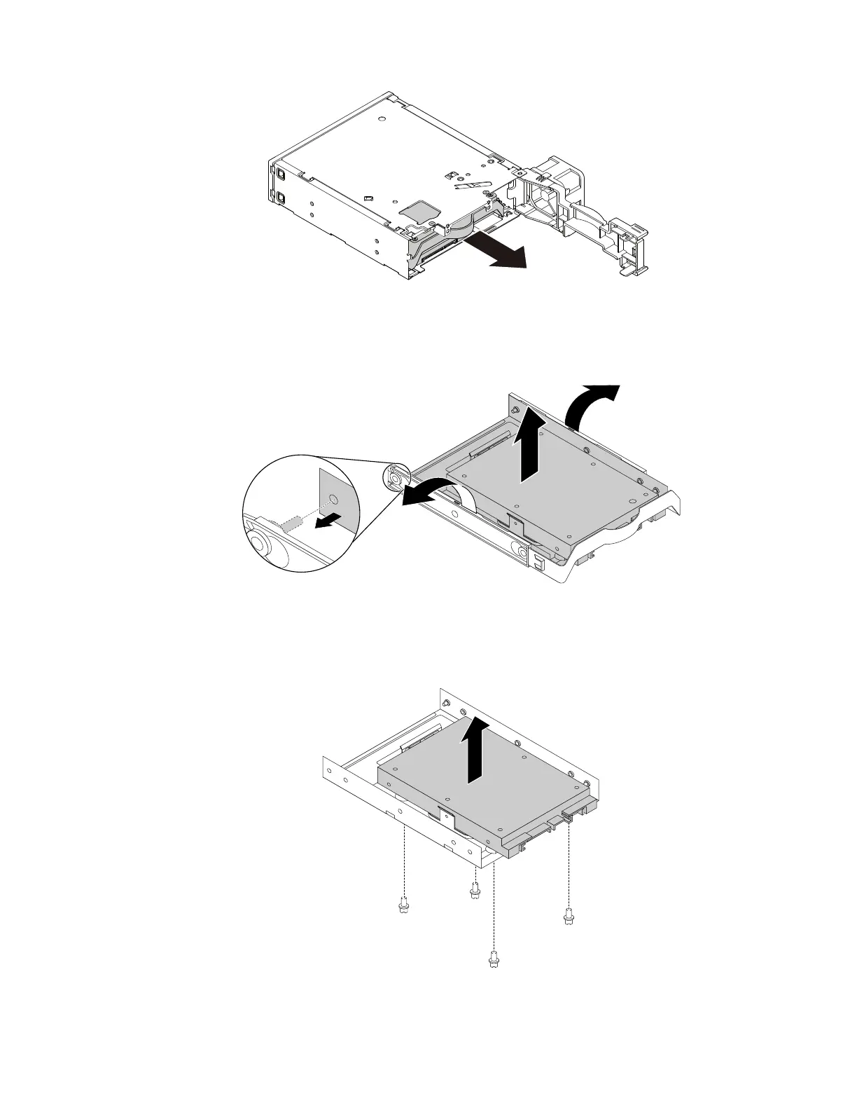 c. Remove the four screws that secure the 2.5-inch storage drive. Then lift the storage drive out of the