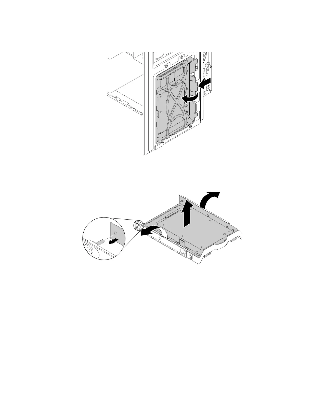 b. Push the tab of the storage-drive bracket as shown and pull the tab outward to remove the storage