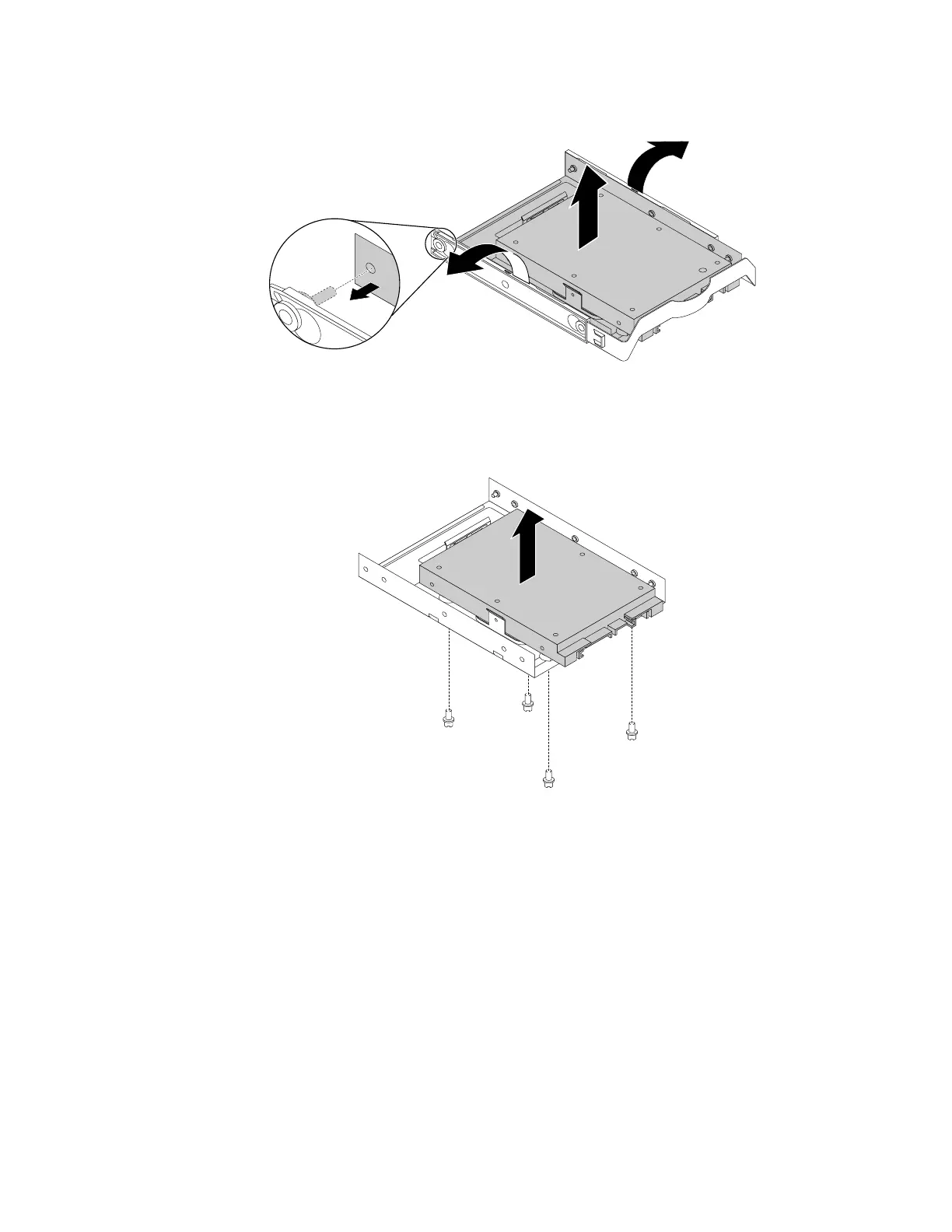 e. Remove the four screws that secure the 2.5-inch storage drive. Then lift the storage drive out of the