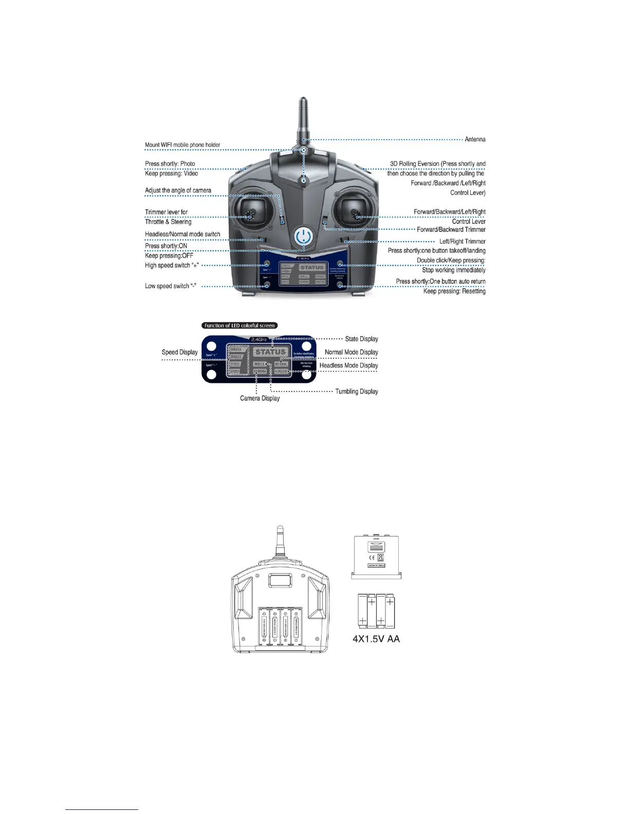 One button take off/one button landing: Press this button to begin flying. To end flying, press this