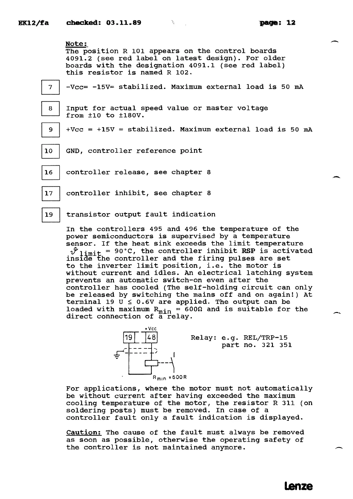 Lenze 493 - Terminal Notes and Fault Indication; Terminal Descriptions and Functions; Temperature Monitoring and Fault Output