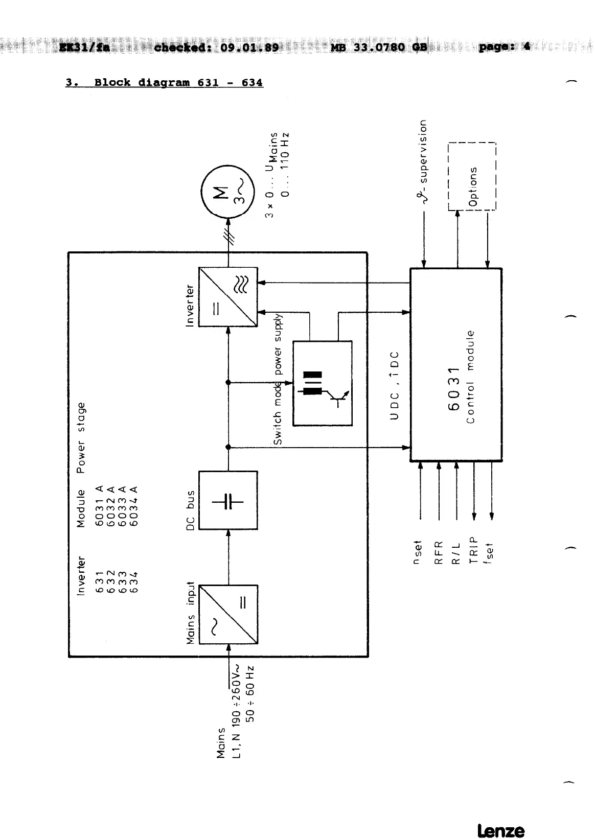 Lenze 633 - Block Diagram 631 - 634; Inverter Module Structure; Mains Input and DC Bus; Control Module and Supervision