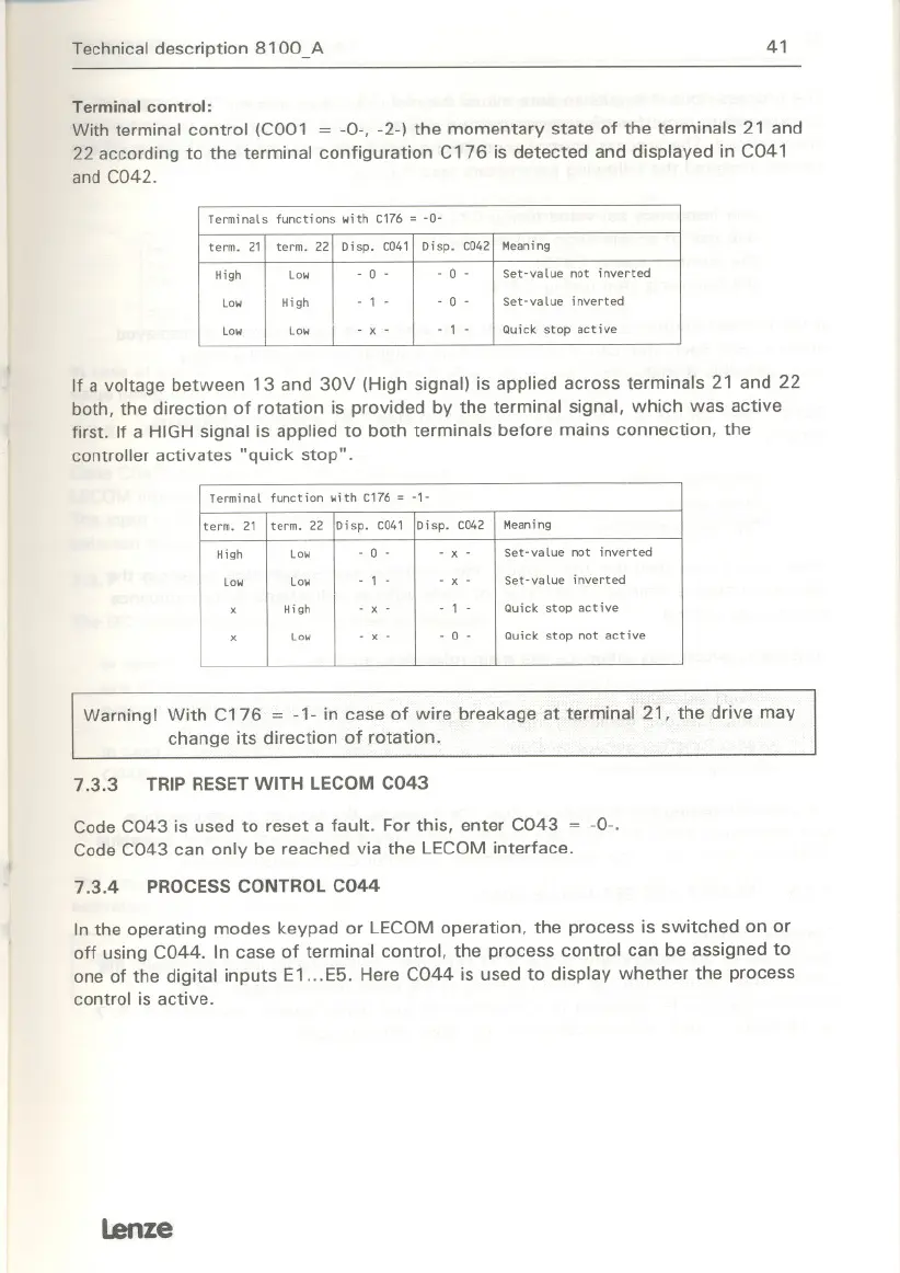 Warningl With C176 = -1- in case of wire breakage at terminal 21, the drive may