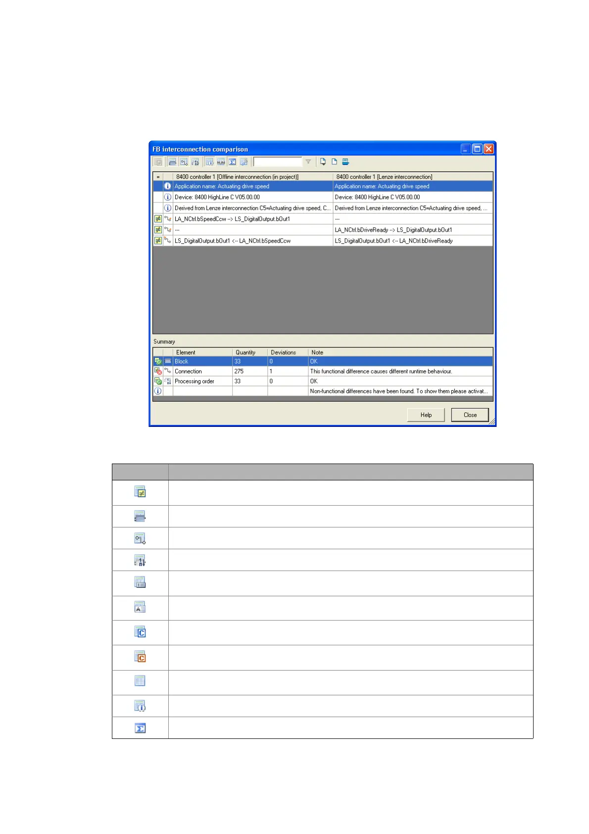 The comparison result is displayed in the form of a list in the FB interconnection comparison dialog