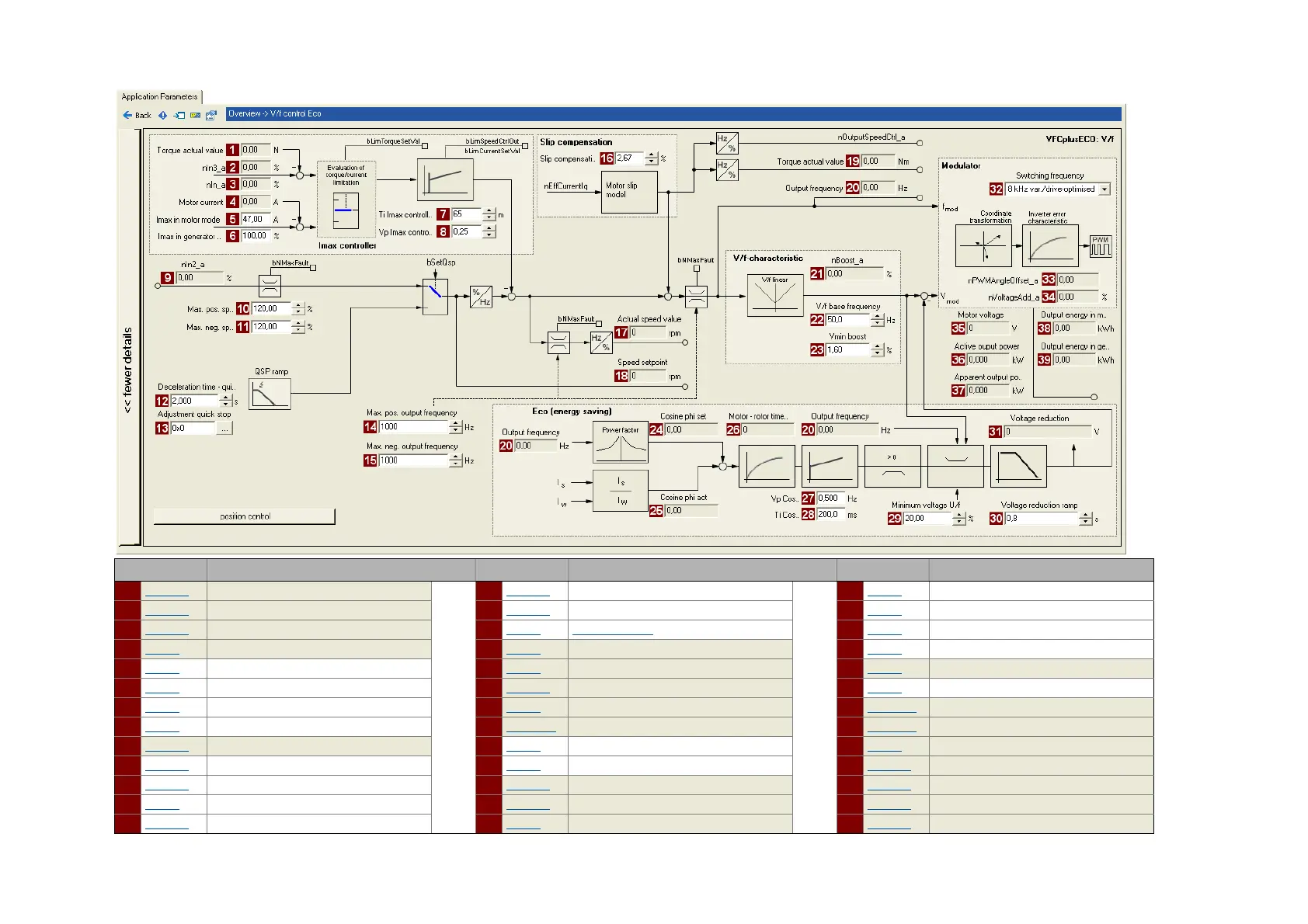 3 C00830/5 Limitation of torque in generator mode 16 C00021 Slip compensation 29 C00977 VFC-ECO: Minimum voltage V/f