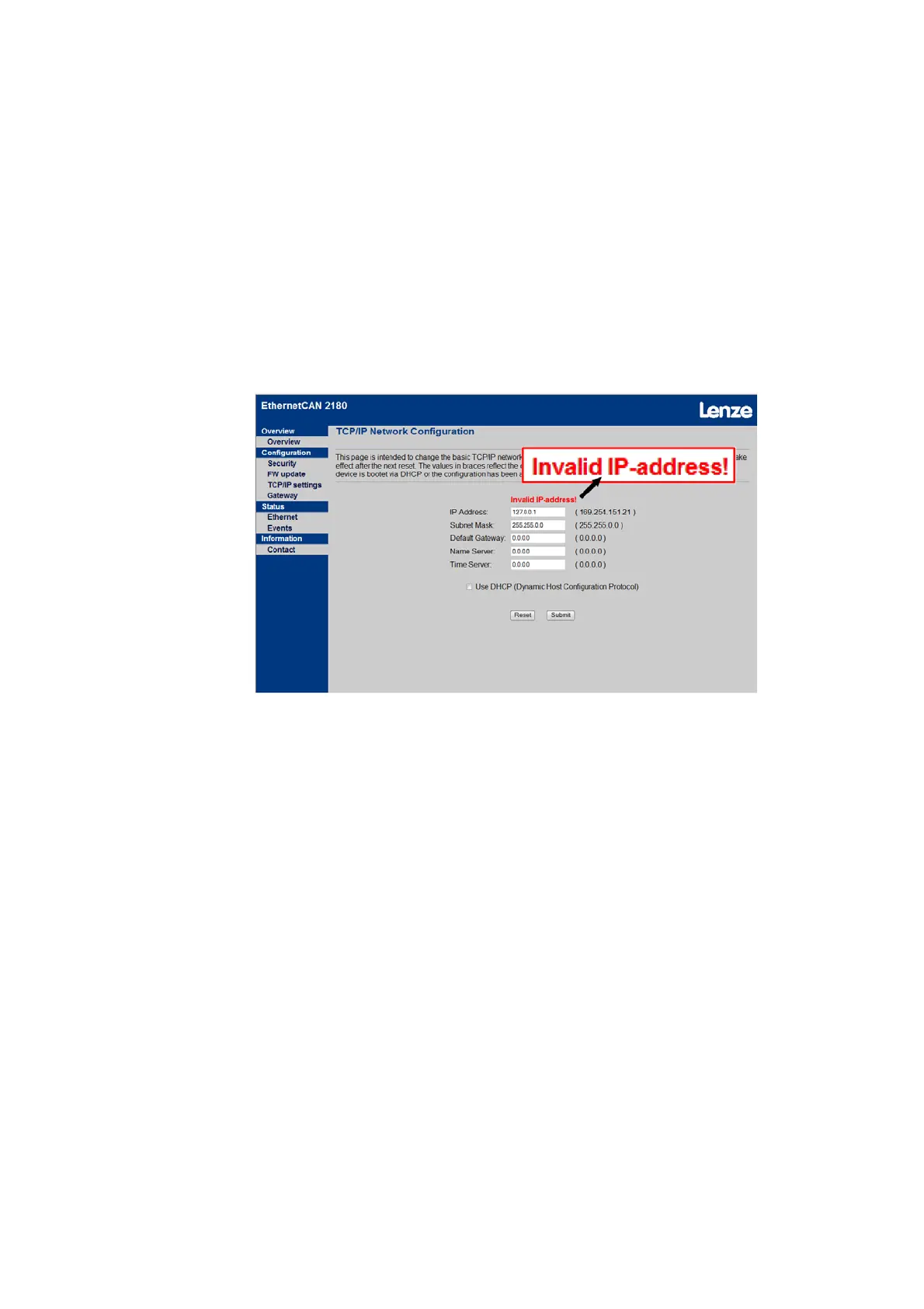 If an invalid combination of IP address and subnet mask is detected, an error message is output via