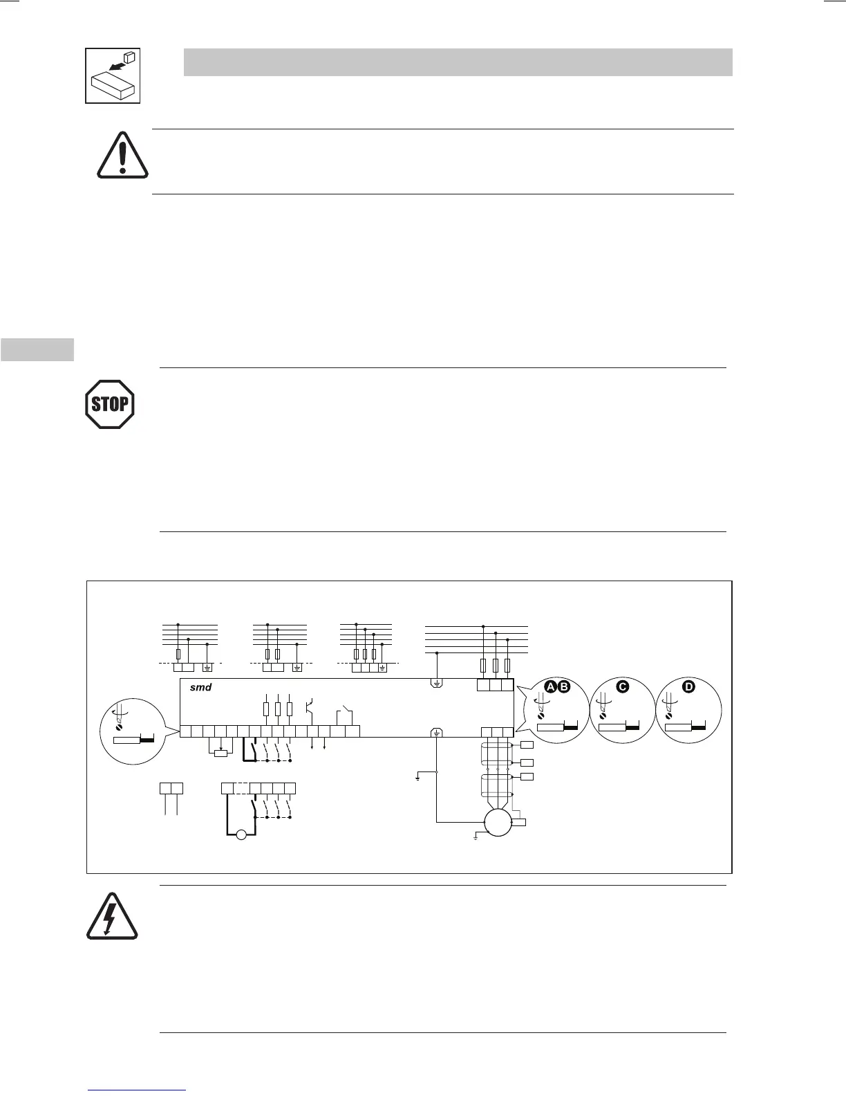 Installation of E.l.c.b only between supplying mains and controller.