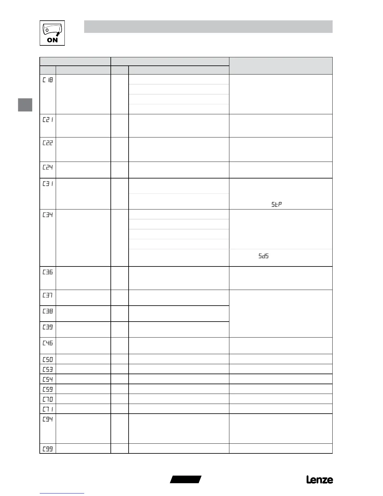 Slip compensation 0.0 0.0 {%} 40.0 Change C21 until the motor speed no