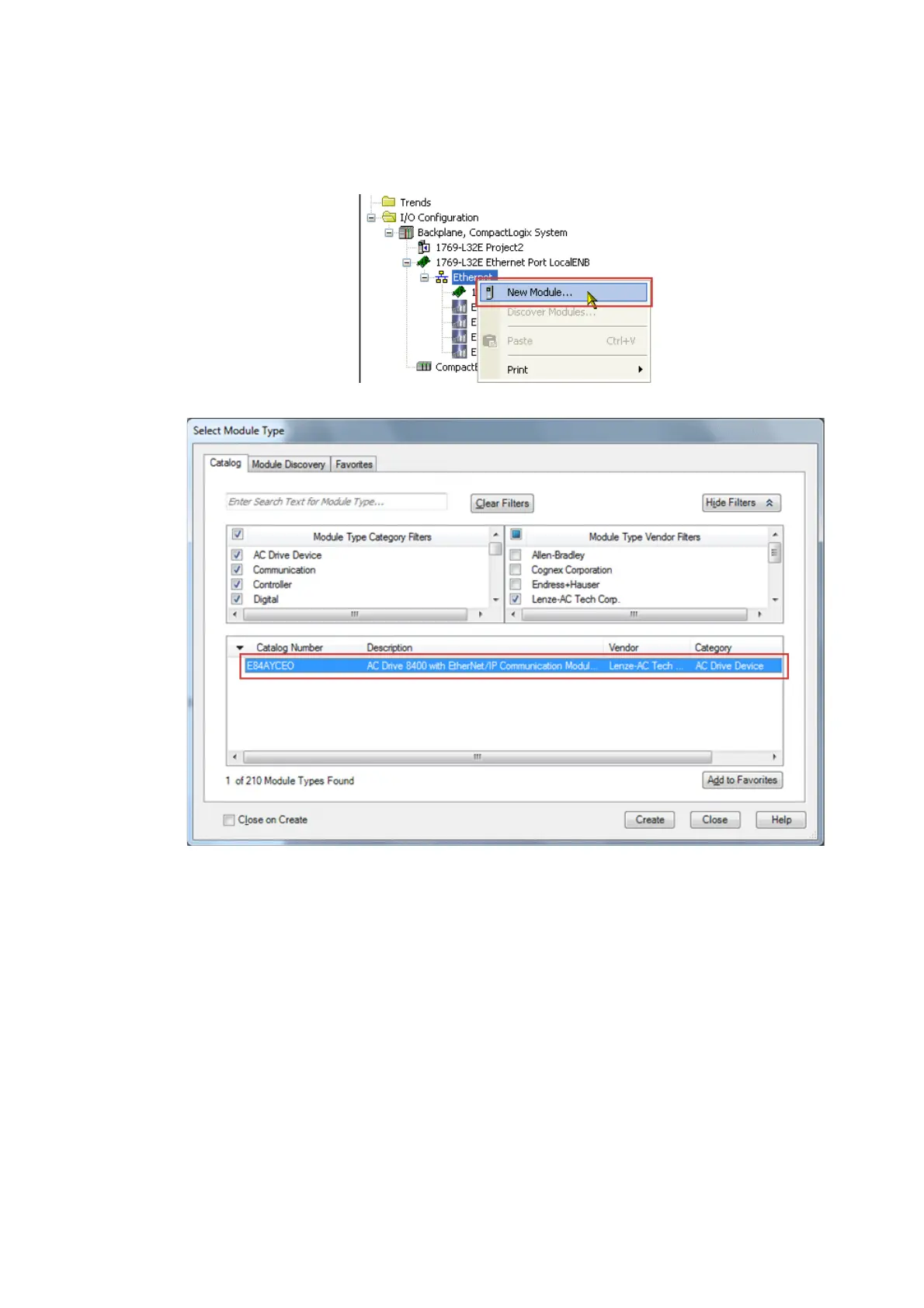 4. Go to the "Select Module Type" dialog box and select "E84AYCEO" on the Catalog tab.