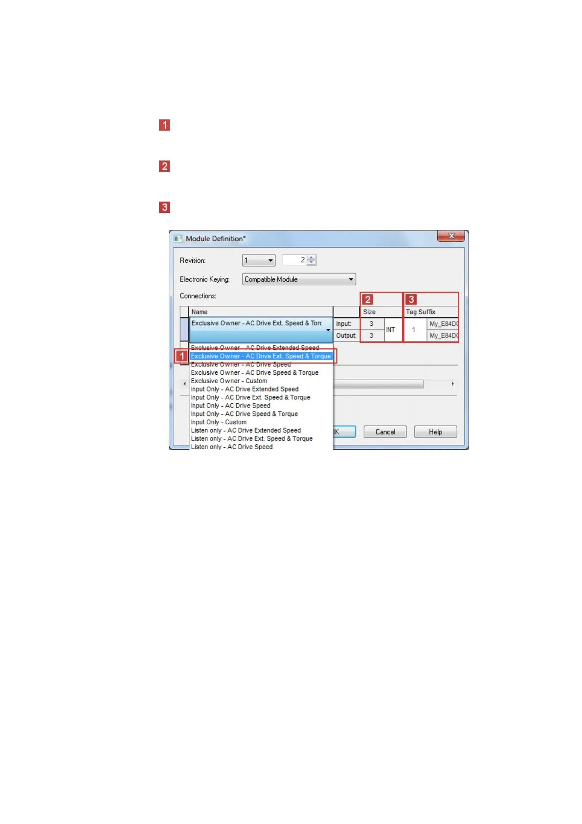 In the example, the AC Drive Profile "Exclusive Owner - AC Drive Ext. Speed & Torque" is