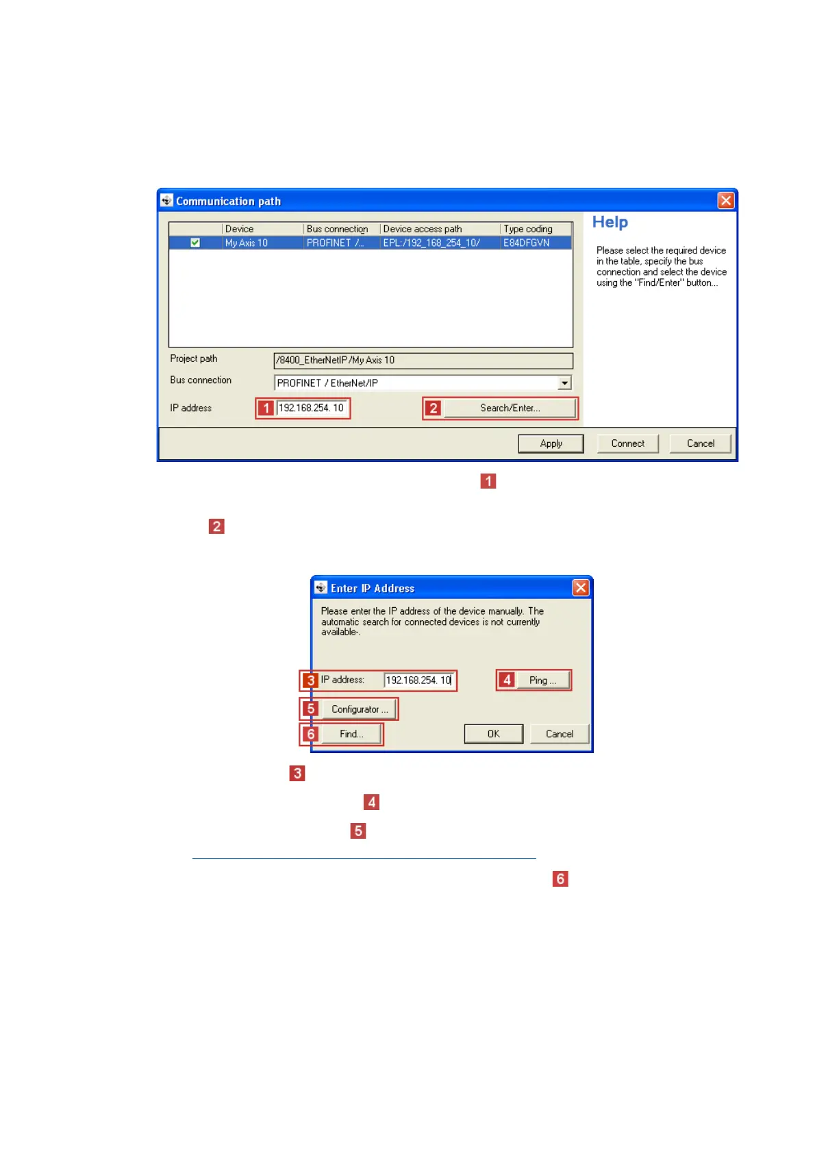 to select the EtherNet/IP communication path. The previously configured EtherNet/IP nodes are