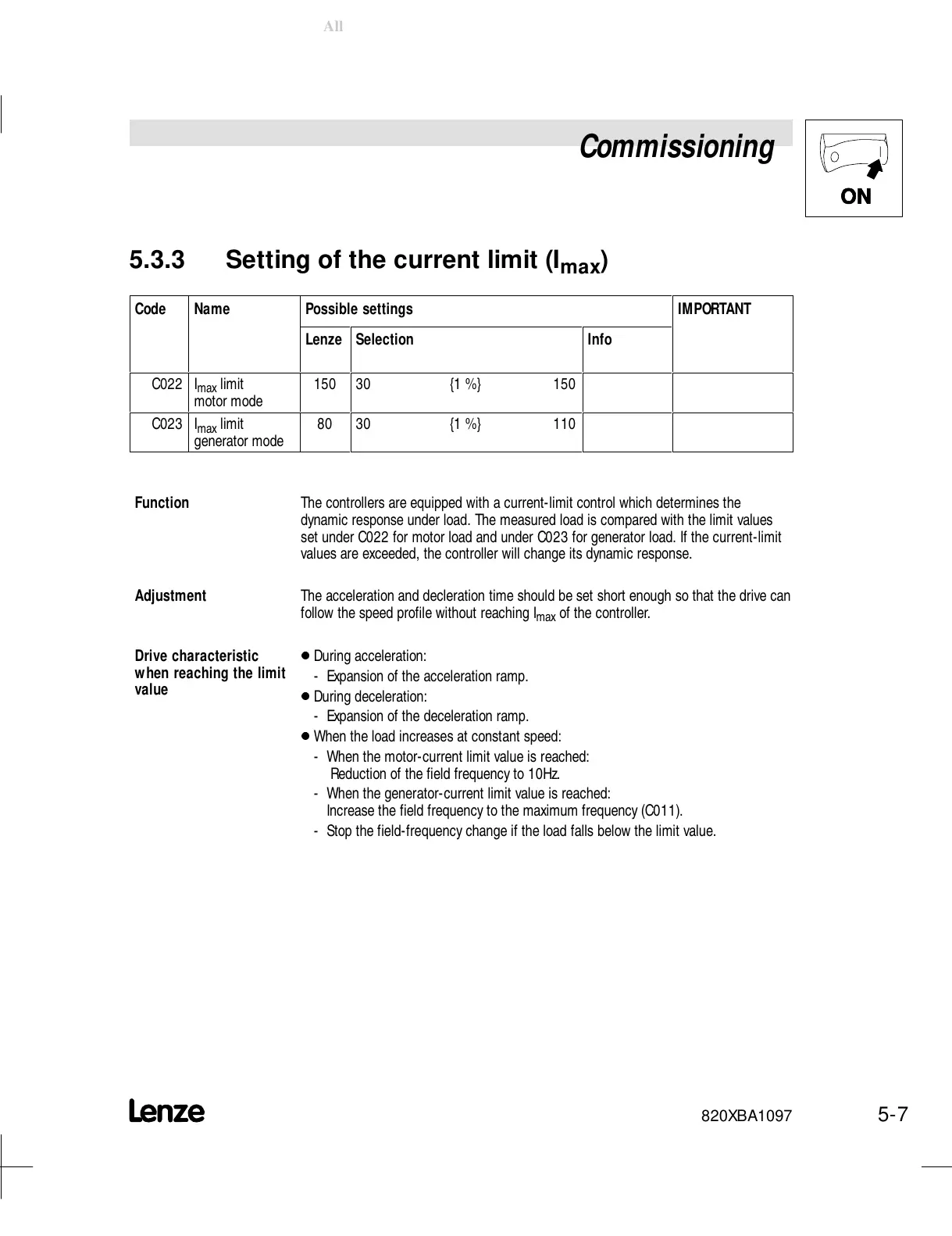 set under C022 for motor load and under C023 for generator load. If the current-limit