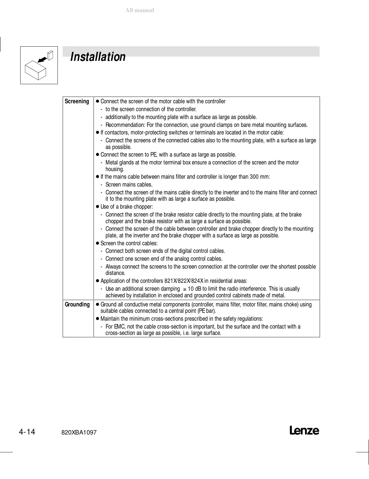 - Connect the screen of the cable between controller and brake chopper directly to the mounting