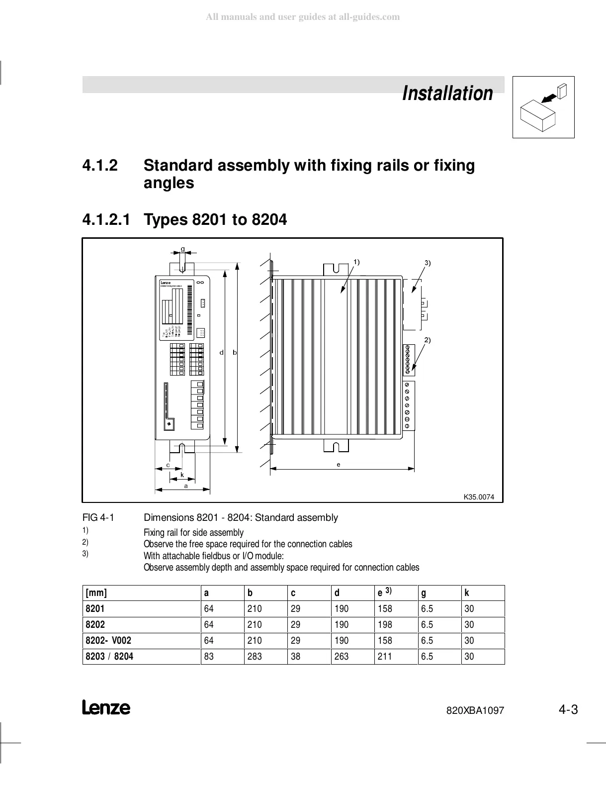 FIG 4-1 Dimensions 8201 - 8204: Standard assembly