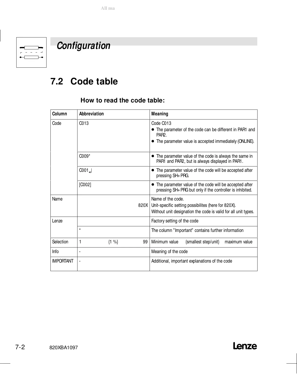 7.2 Code table