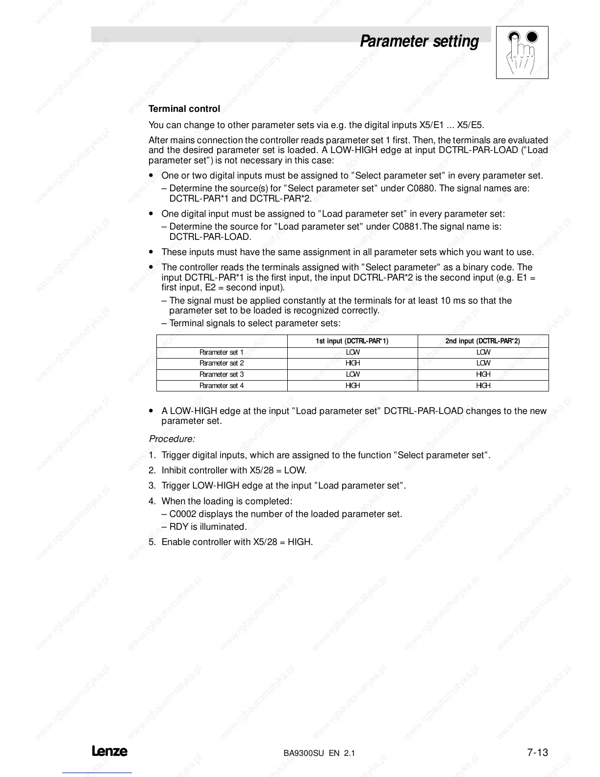 • One digital input must be assigned to ”Load parameter set” in every parameter set: