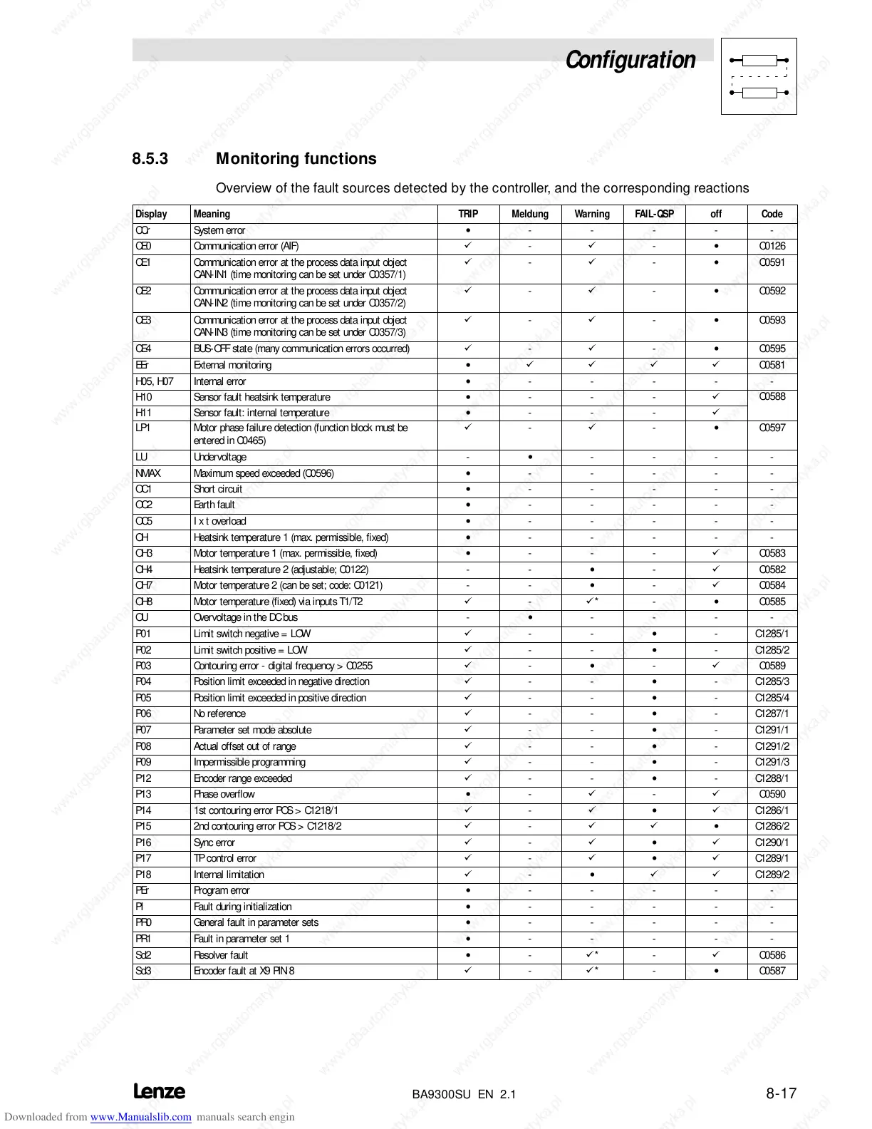 Overview of the fault sources detected by the controller, and the corresponding reactions
