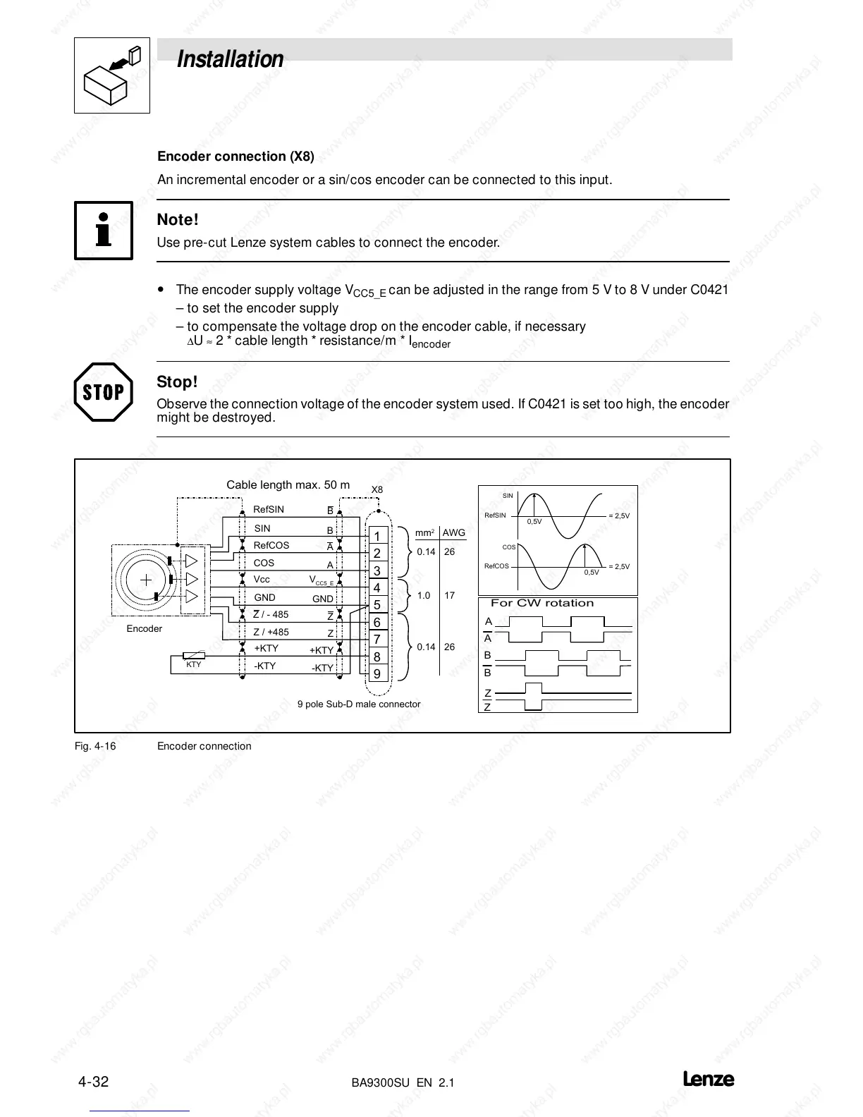 Observe the connection voltage of the encoder system used. If C0421 is set too high, the encoder