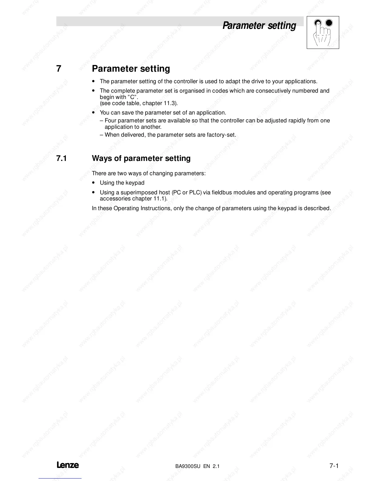 • The parameter setting of the controller is used to adapt the drive to your applications.