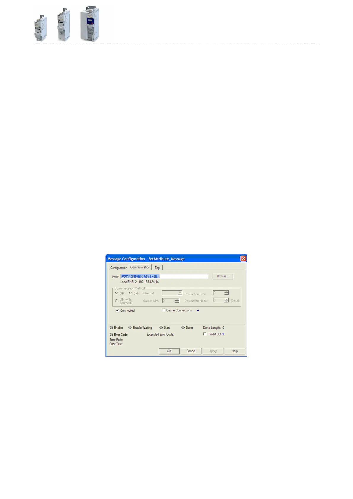 the Ethernet port of the PLC (scanner) to the IP address of the inverter (adapter). This path