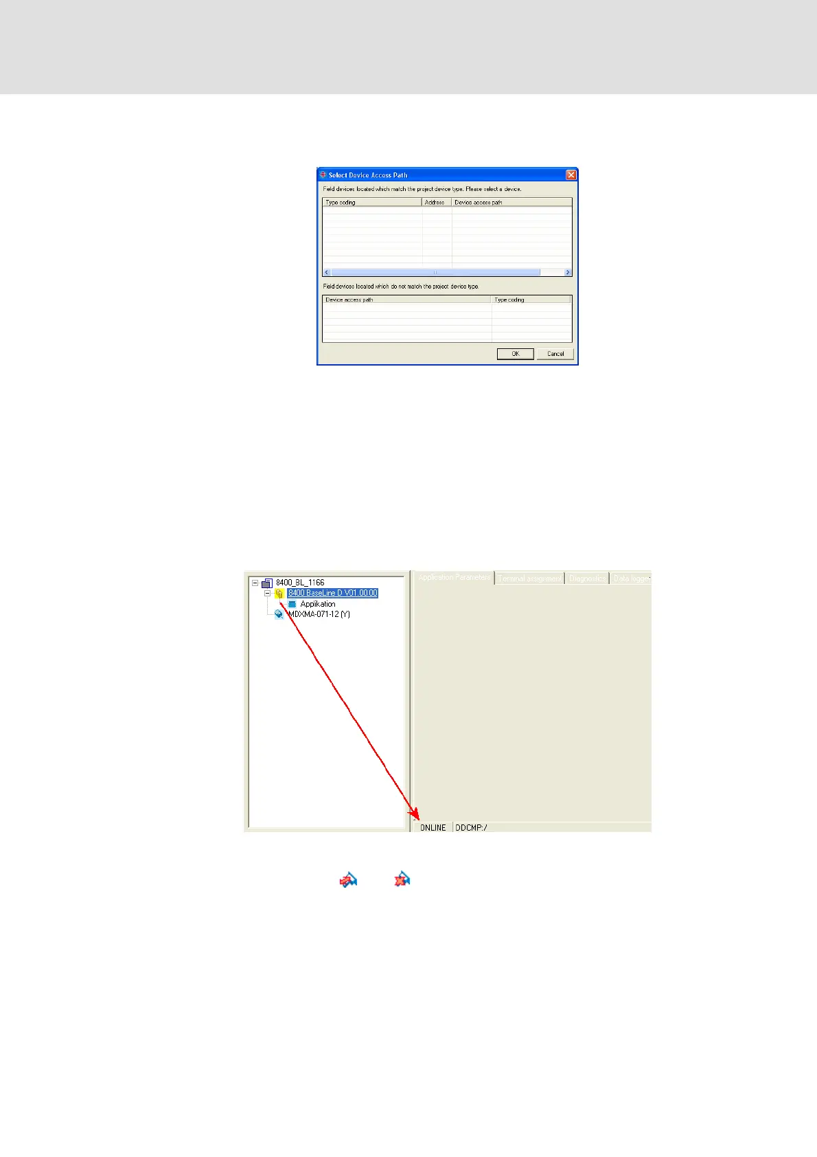• The dialog box is closed and the online connection with the controller is built up.
