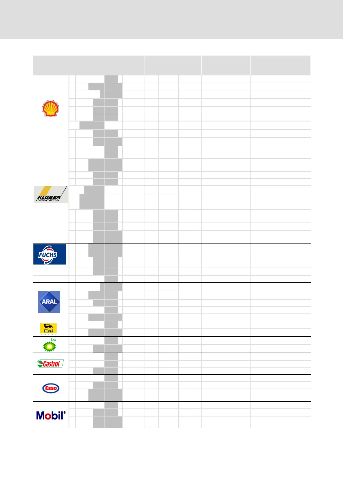 Table of lubricants