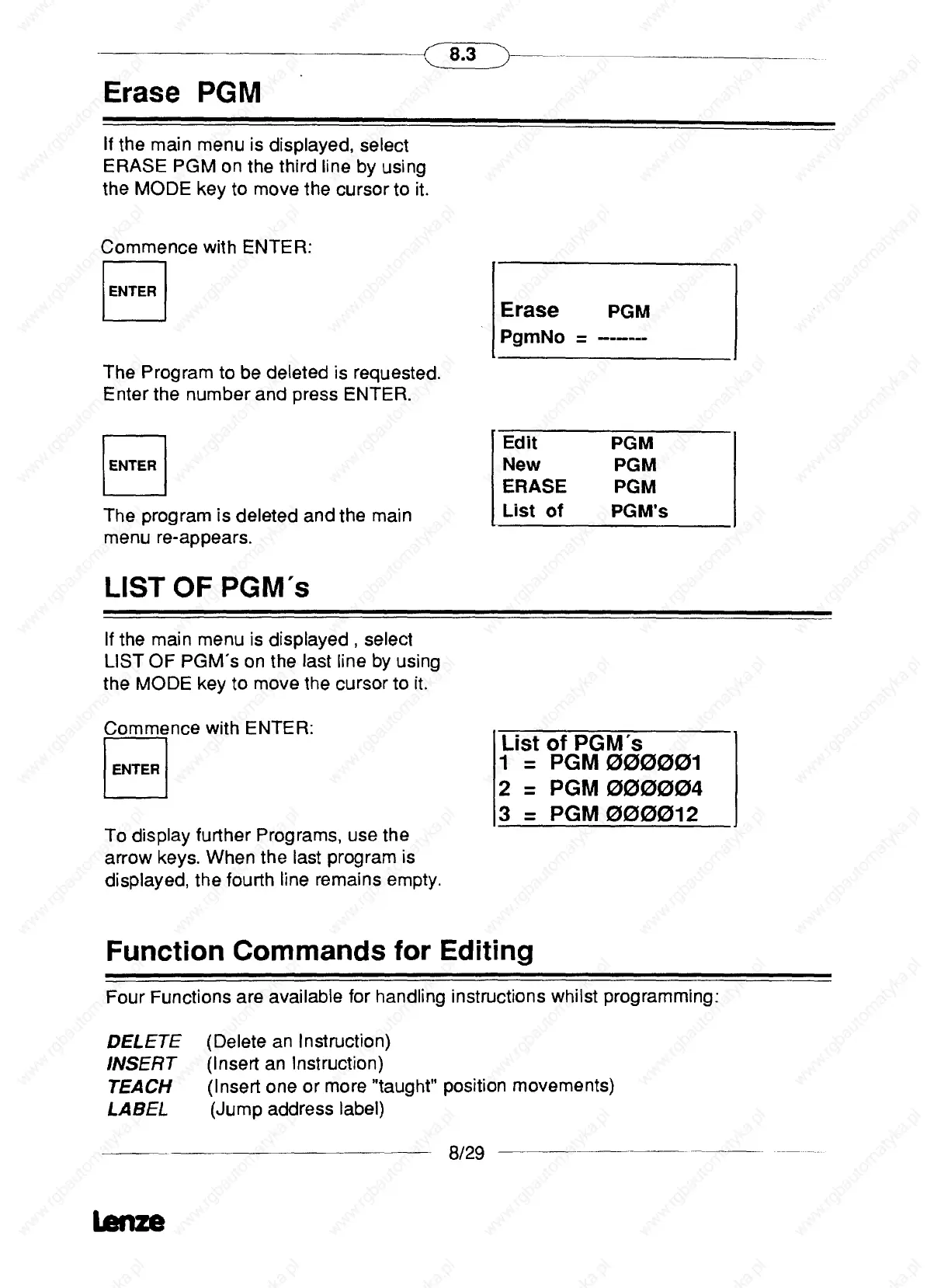 Lenze SX-1 - Erase PGM and List Programs; Editing Function Commands