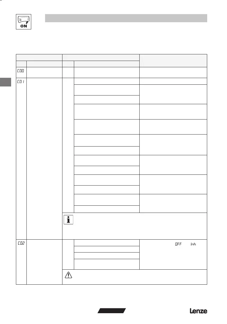 • Wenn C01 = 1, 5, 7, 9 oder 11 und C14 = 0 ... 4, 6, 7, dann c40 für Drehzahl-