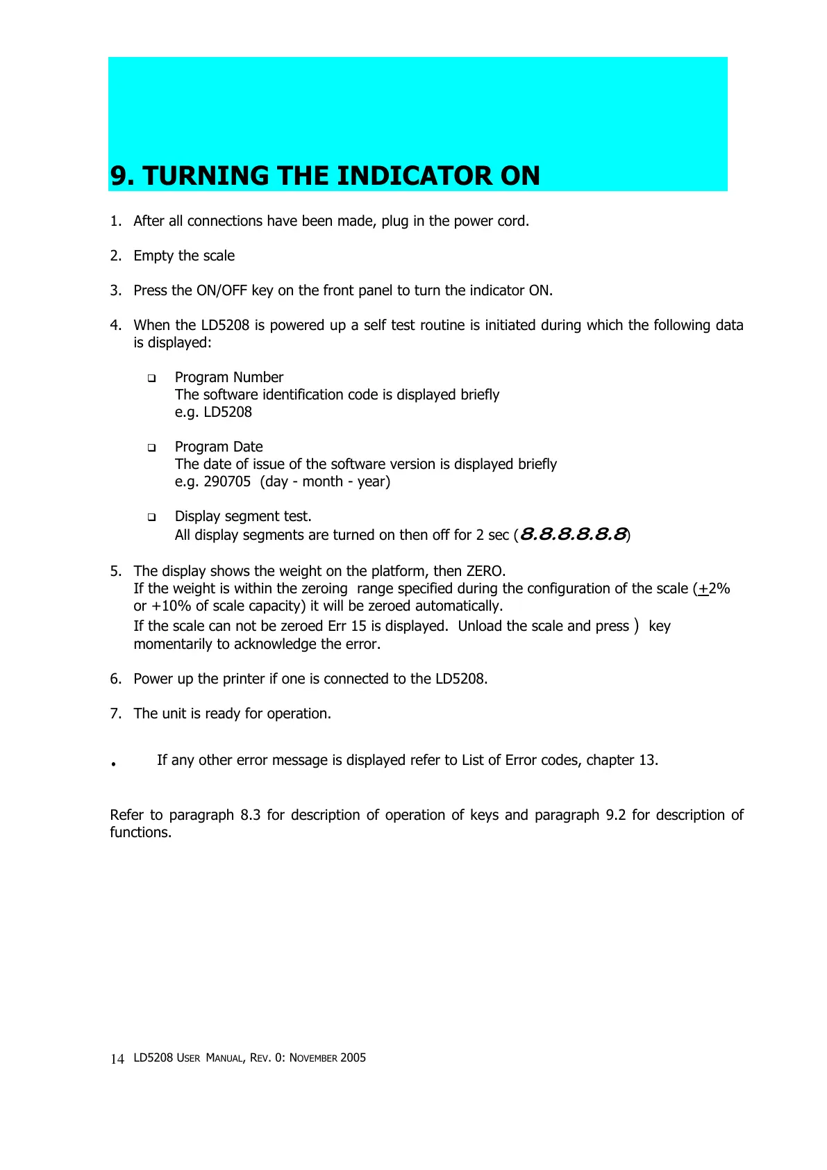 Refer to paragraph 8.3 for description of operation of keys and paragraph 9.2 for description of