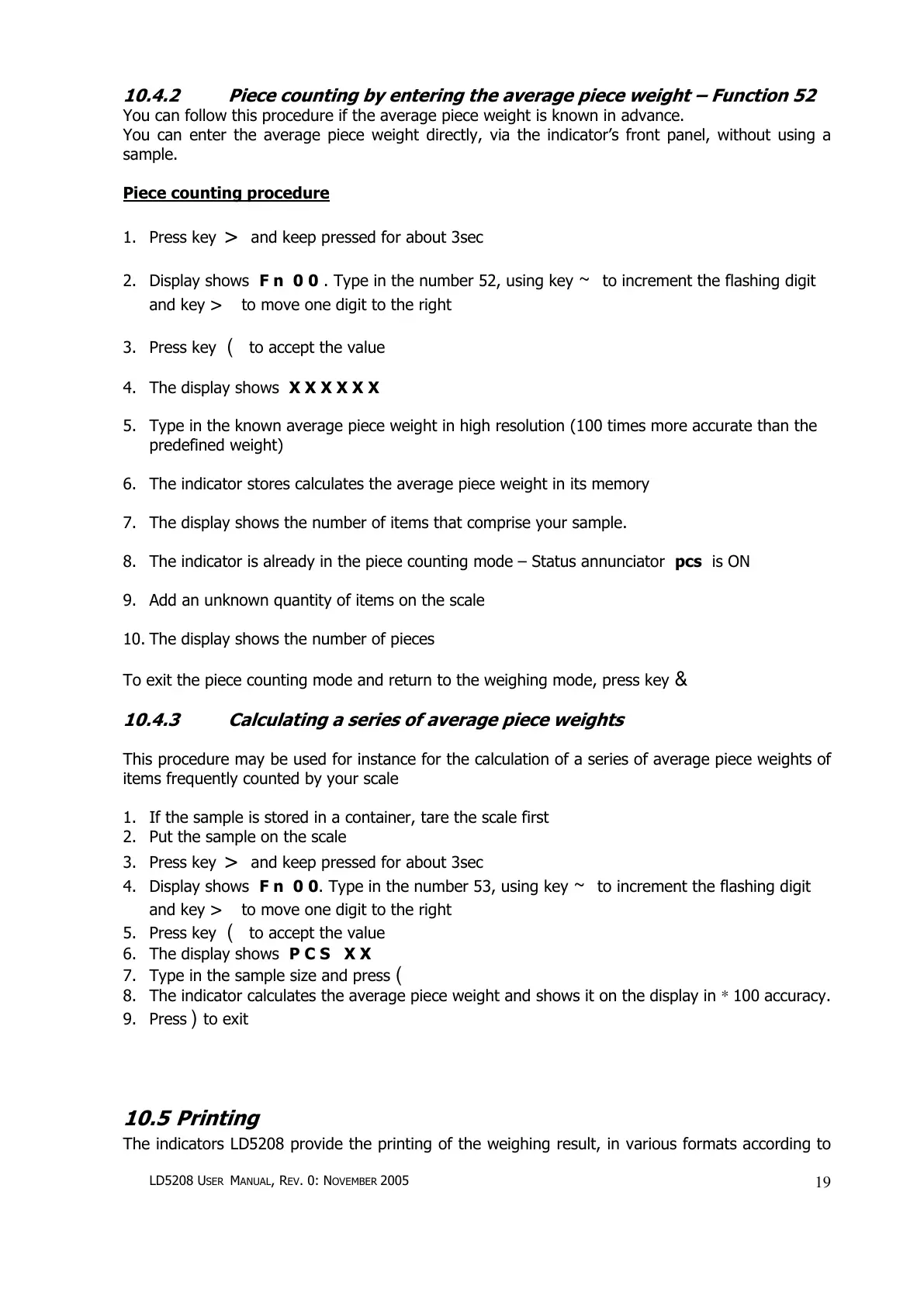 10.4.2 Piece counting by entering the average piece weight ā Function 52