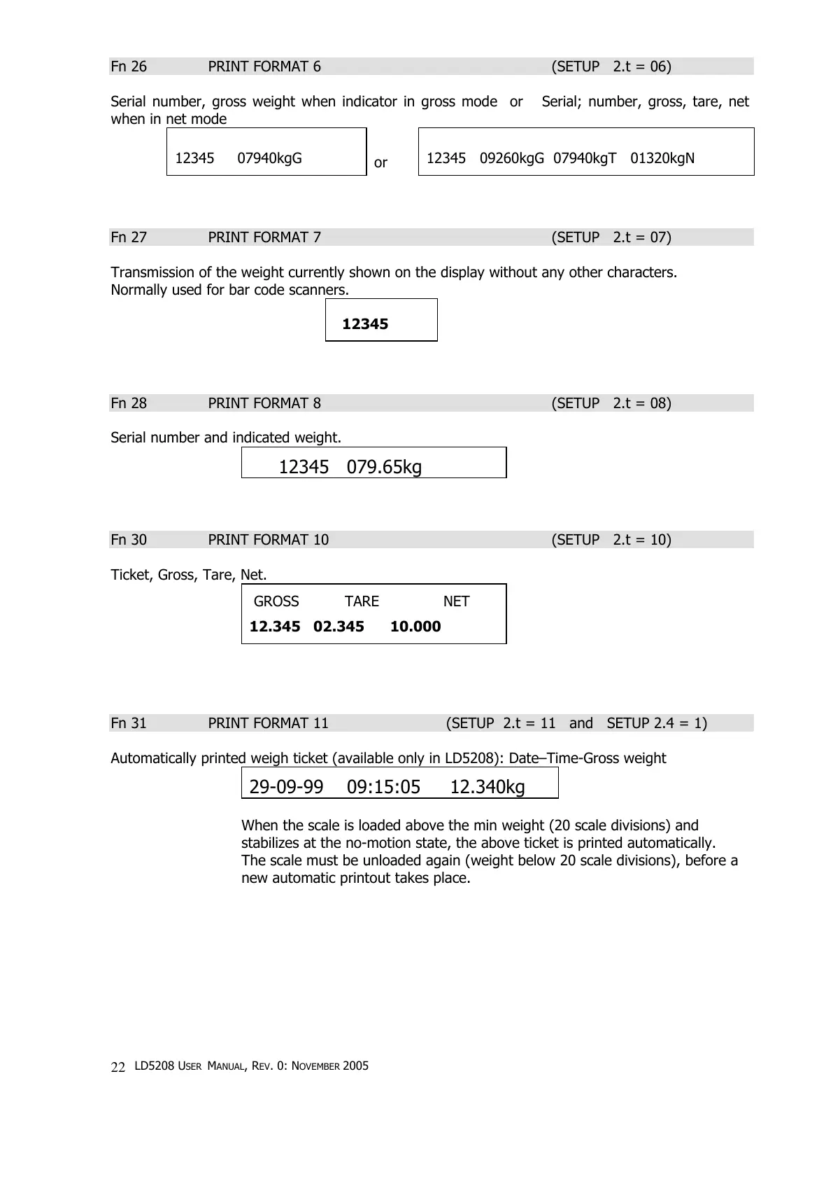 Automatically printed weigh ticket (available only in LD5208): Date–Time-Gross weight