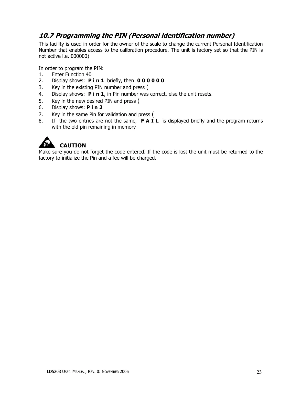 10.7 Programming the PIN (Personal identification number)